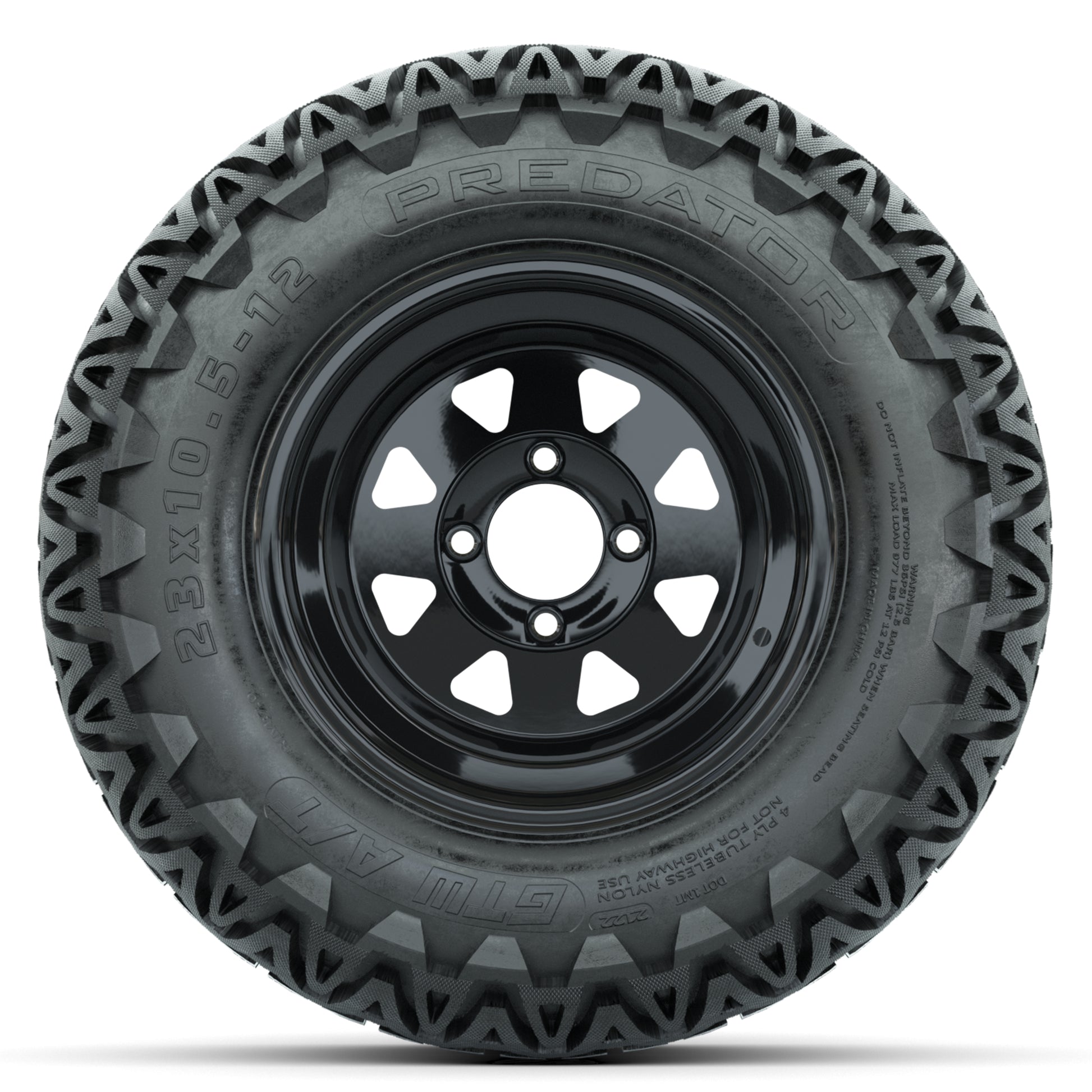 12" Gloss Black Steel Spoke Golf Cart Wheels & 23x10.5x12 Predator All Terrain Tires – Set of 4