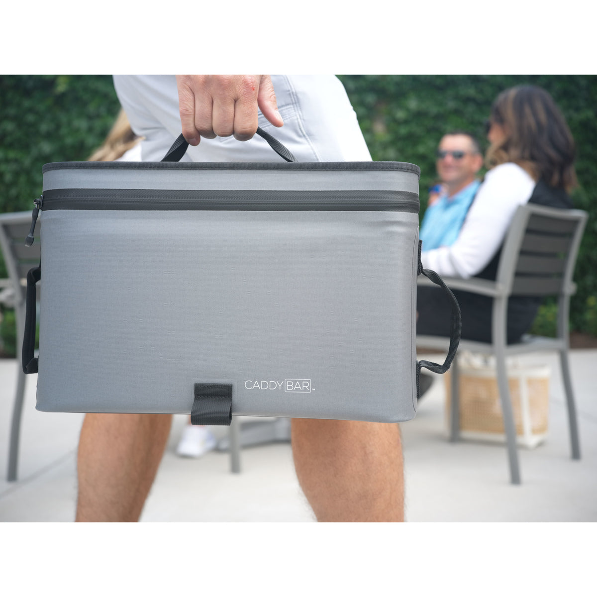 The CADDYBAR™ Cooler is a high-performance and durable cooler made from 600D bonded nylon with inner polyethylene support to resist sagging, punctures, and outdoor elements. It is lightweight, features three handles for convenient carrying, and offers flexible closure options for use inside or outside the cart. The insulated and leak-resistant design keeps up to nine (9) cans of your favorite drink or two (2) wine bottles cold and still has room for ice. It also comes with a strong back bracket for quick attachment to your CADDYBAR ™ system (sold separately).