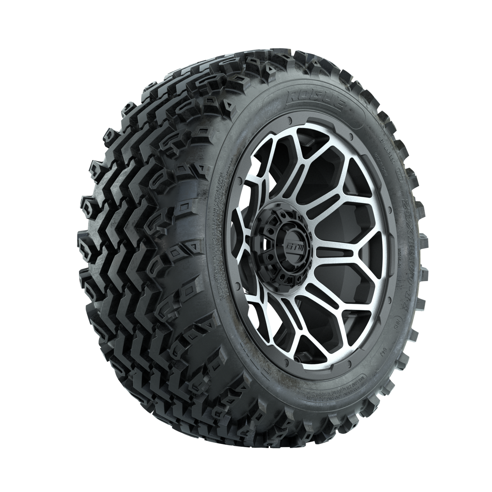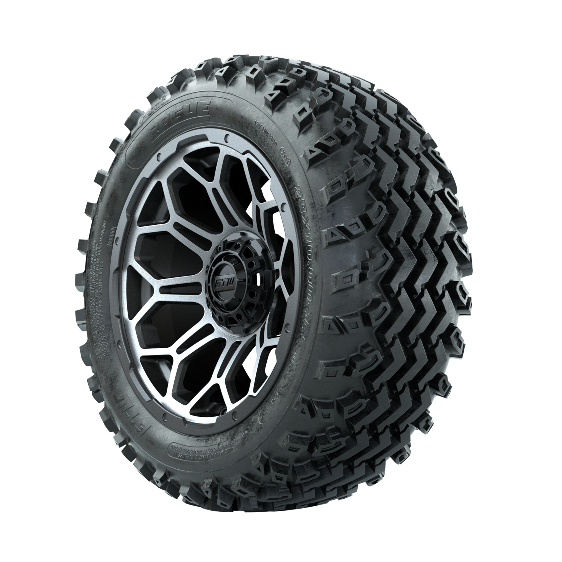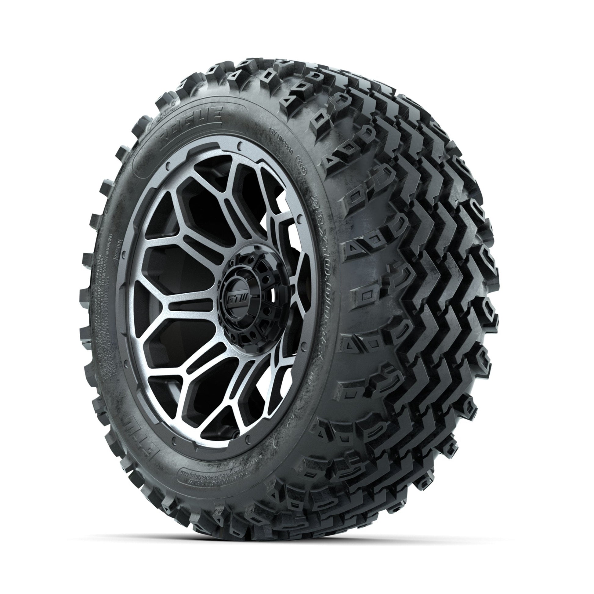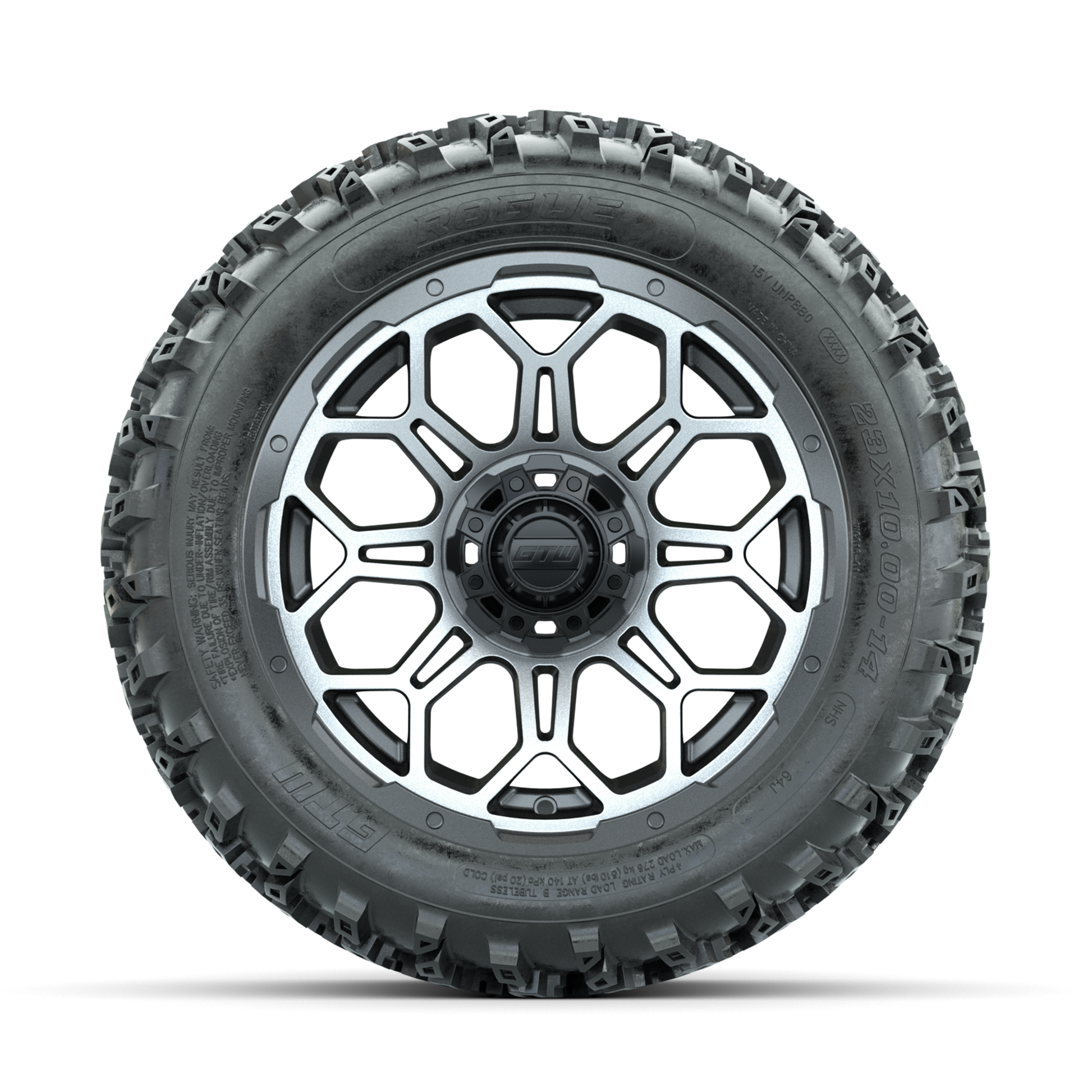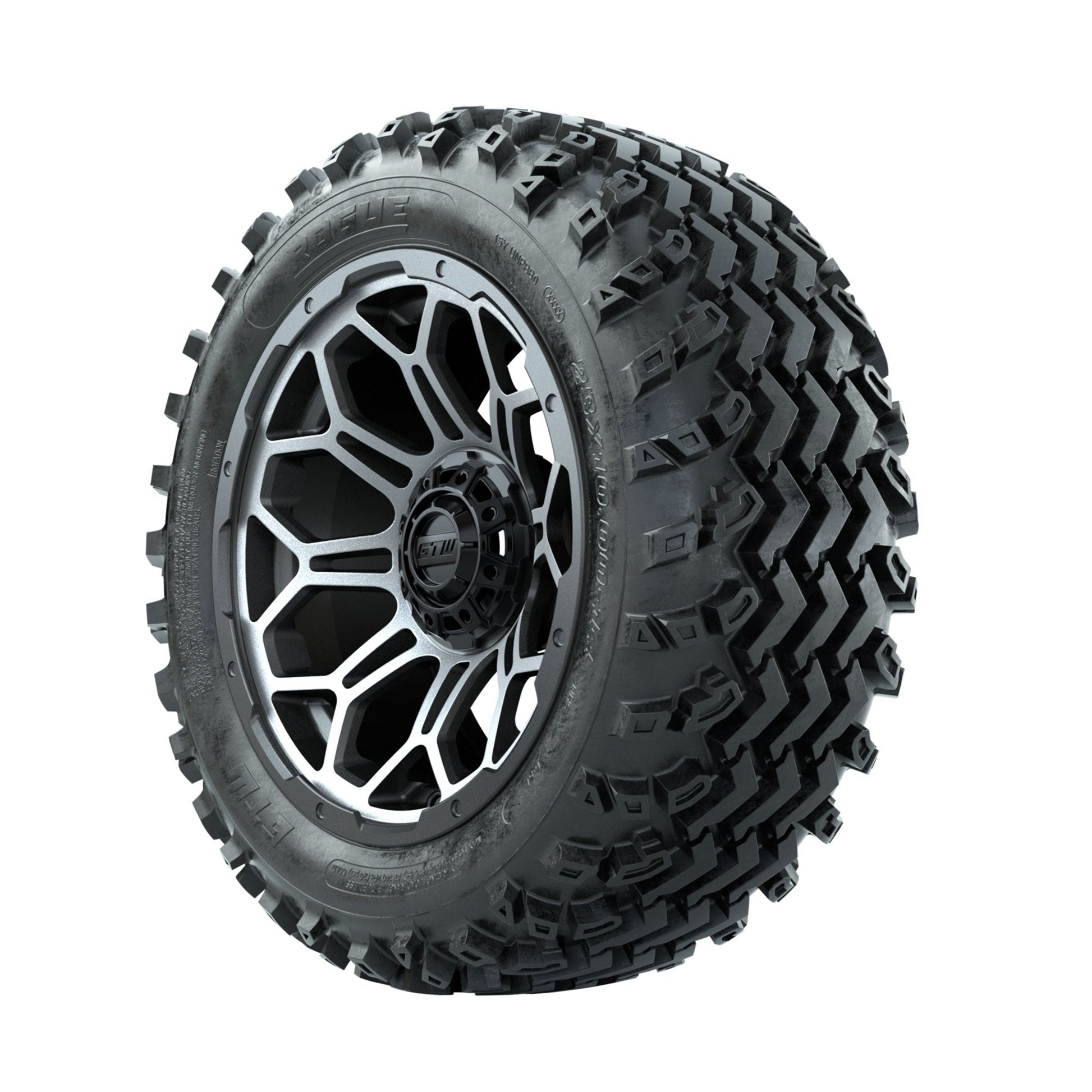 | Product Description: | A set of (4) 14-inch GTW-Bravo Machined/Matte Grey golf cart wheels Mounted on 23x10.00-14 Rogue All-Terrain Tires Tread Classification: All-Terrain Full Tire & Wheel Combo Includes: (4) 14x7 GTW-Bravo Wheels / Machined/Matte Grey finish / Offset: 3:4 (ET -.25) (4) 23x10.00-14 GTW Rogue All-Terrain Tires / Tire is approx. 23- tall (4-Ply) (4) Center caps Please Note: All Wheels are 4 on 4 Hole / Lug Pattern unless otherwise specified. Tech Tips: We Recommend a Minimum 3- Lift Kit for This Tire & Wheel Combo (Tire is approx. 23- OD) Please Check and Adjust PSI in Tires Before Operation (Recommended Inflation Can Be Found on Sidewall of Tire) Tire & Wheel Combos are mounted and Inflated Before Shipping, Free of Charge All Wheels Have a lug pattern of "4x101.6mm" Lug Nuts Sold Separately: Standard Chrome Lug Nuts #LUG4S Metric Chrome Lug Nuts #LUG4M (Yamaha Models) |