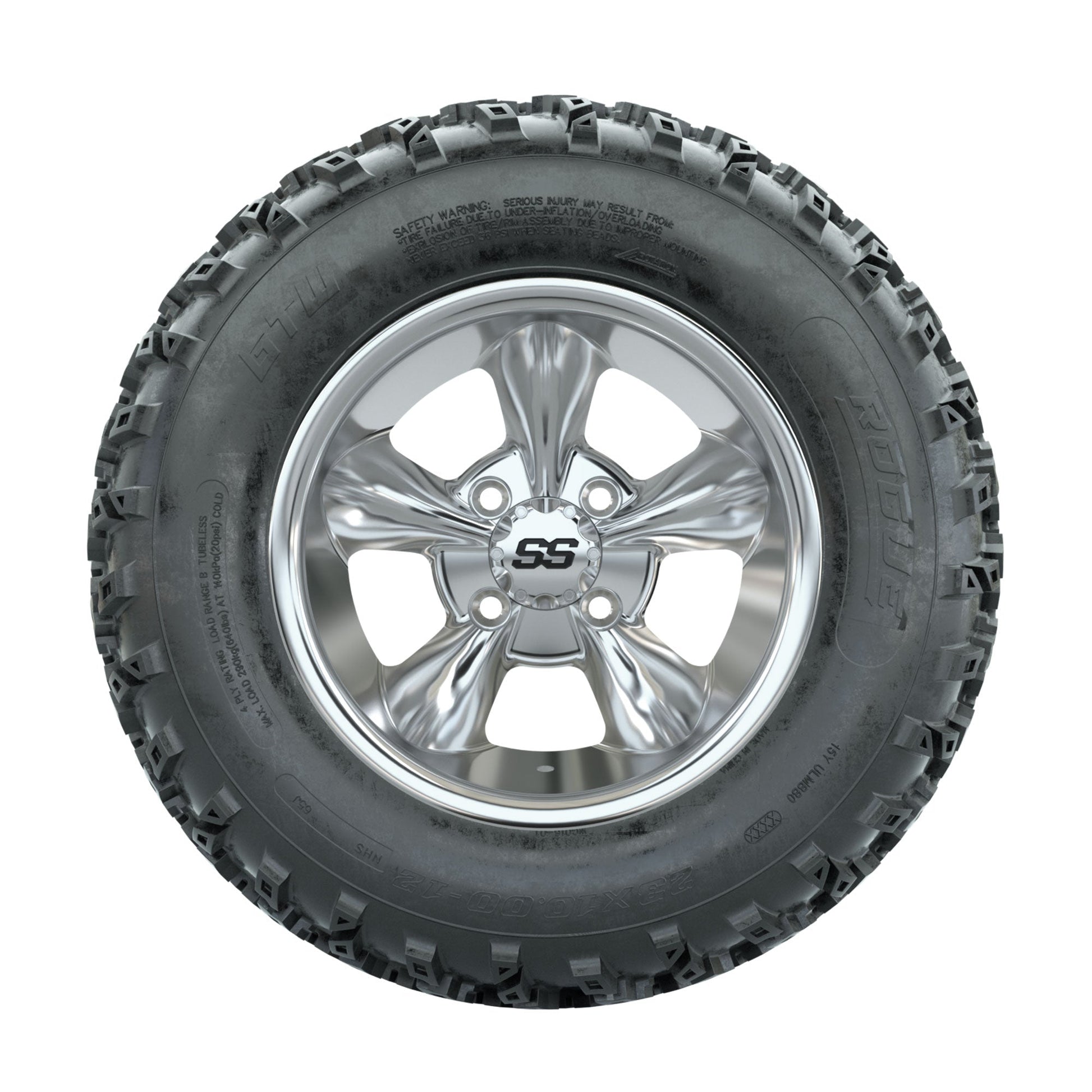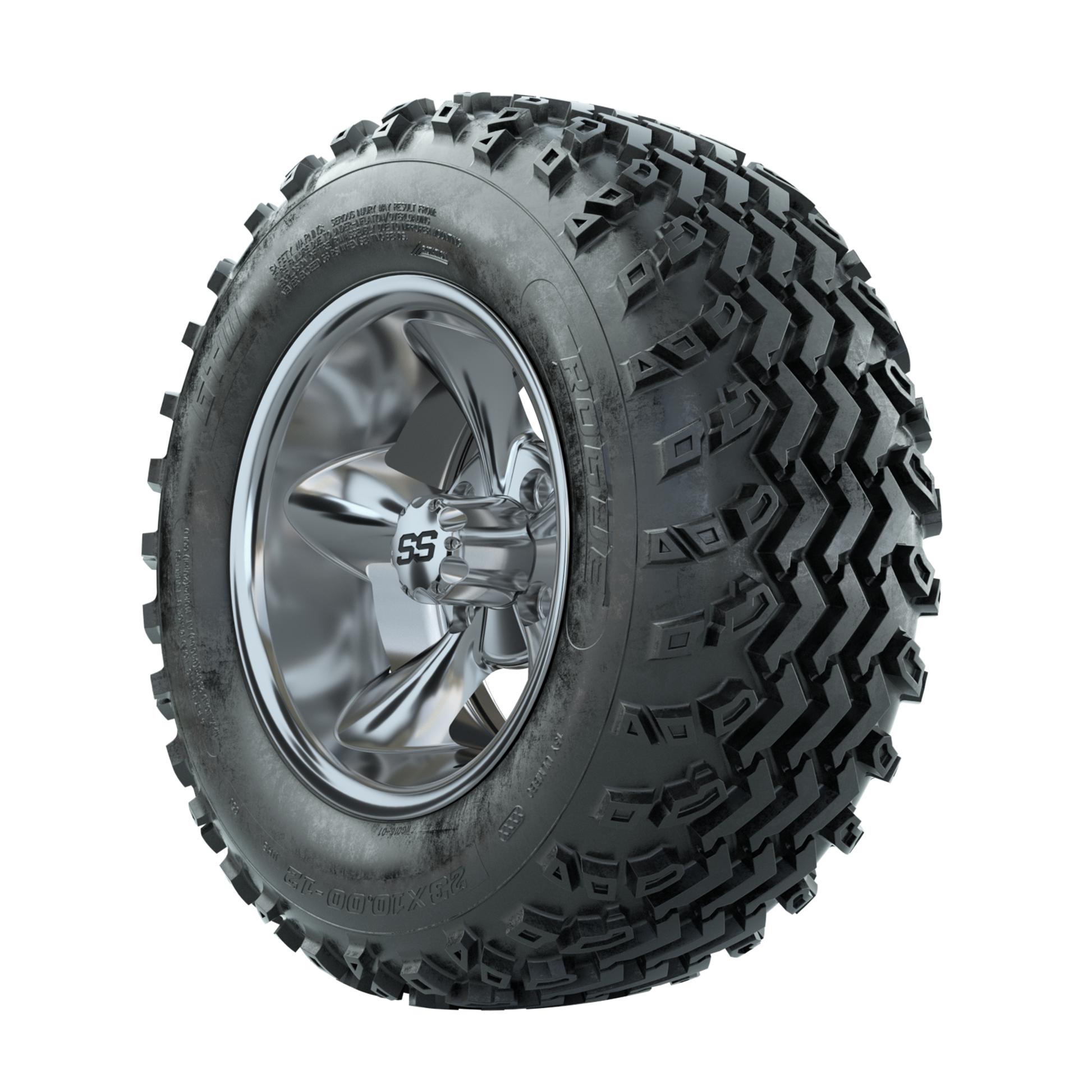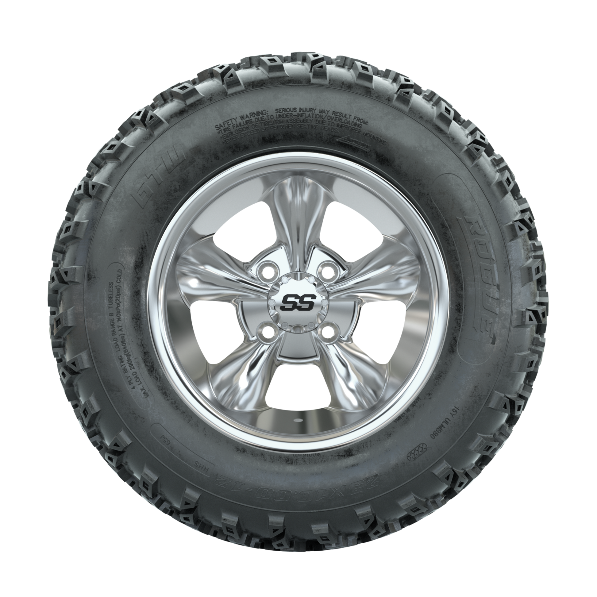 | Product Description: | A set of (4) 12-inch GTW-Godfather Chrome golf cart wheels Mounted on 23x10.00-12 Rogue All-Terrain Tires Tread Classification: All-Terrain Full Tire & Wheel Combo Includes: (4) 12x7 GTW-Godfather Wheels / Chrome finish / Offset: 3:4 (ET -.25) (4) 23x10.00-12 GTW Rogue All-Terrain Tires / Tire is approx. 23- tall (4-Ply) (4) Center caps Please Note: All Wheels are 4 on 4 Hole / Lug Pattern unless otherwise specified. Tech Tips: We Recommend a Minimum 3- Lift Kit for This Tire & Wheel Combo (Tire is approx. 23- OD) Please Check and Adjust PSI in Tires Before Operation (Recommended Inflation Can Be Found on Sidewall of Tire) Tire & Wheel Combos are mounted and Inflated Before Shipping, Free of Charge All Wheels Have a lug pattern of "4x101.6mm" Lug Nuts Sold Separately: Standard Chrome Lug Nuts #LUG4S Metric Chrome Lug Nuts #LUG4M (Yamaha Models) |