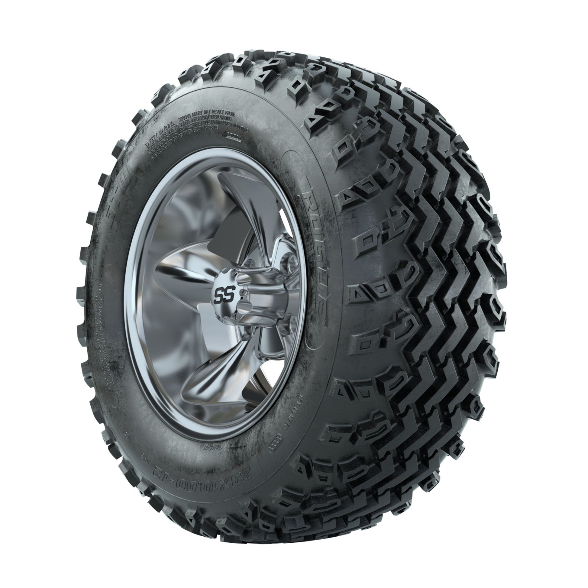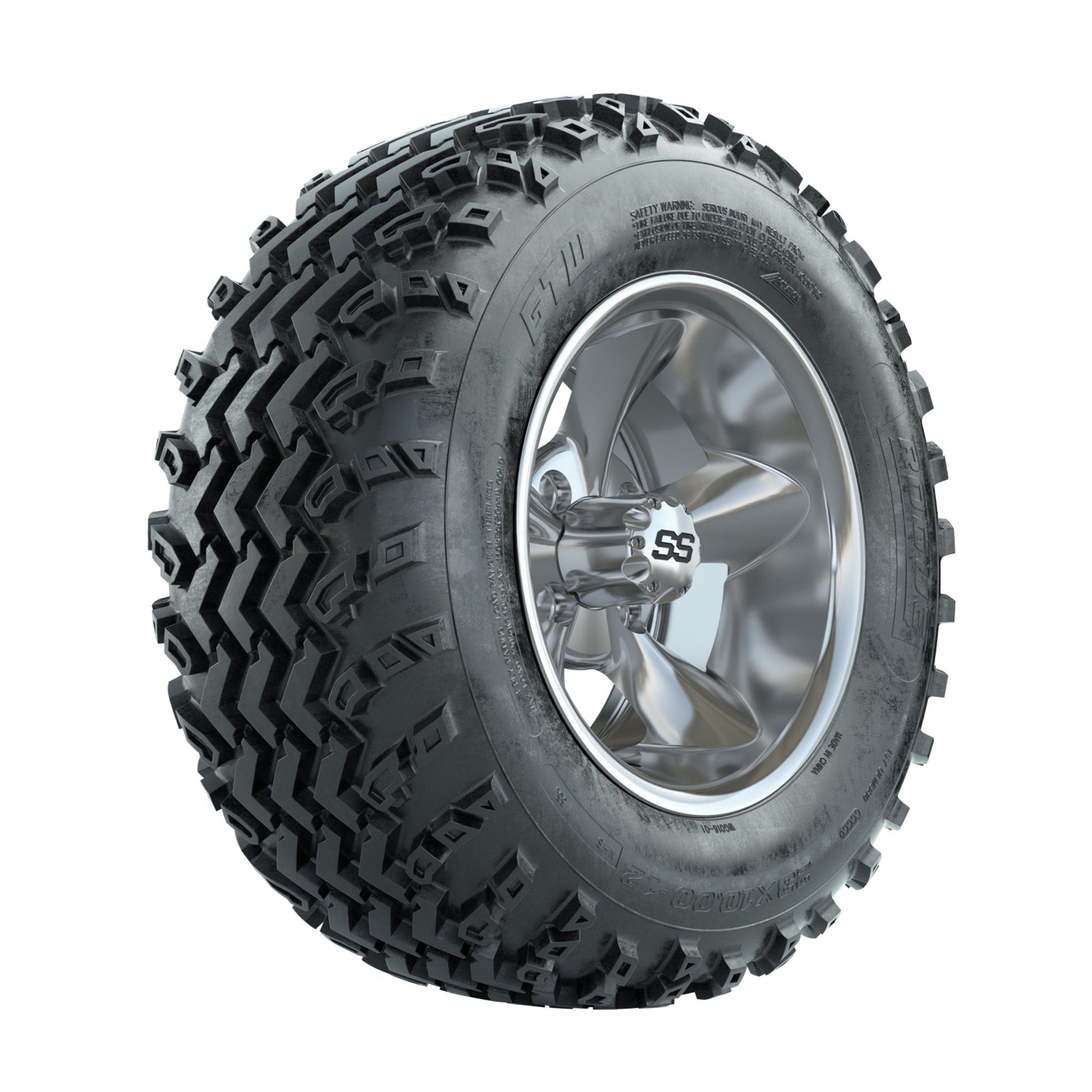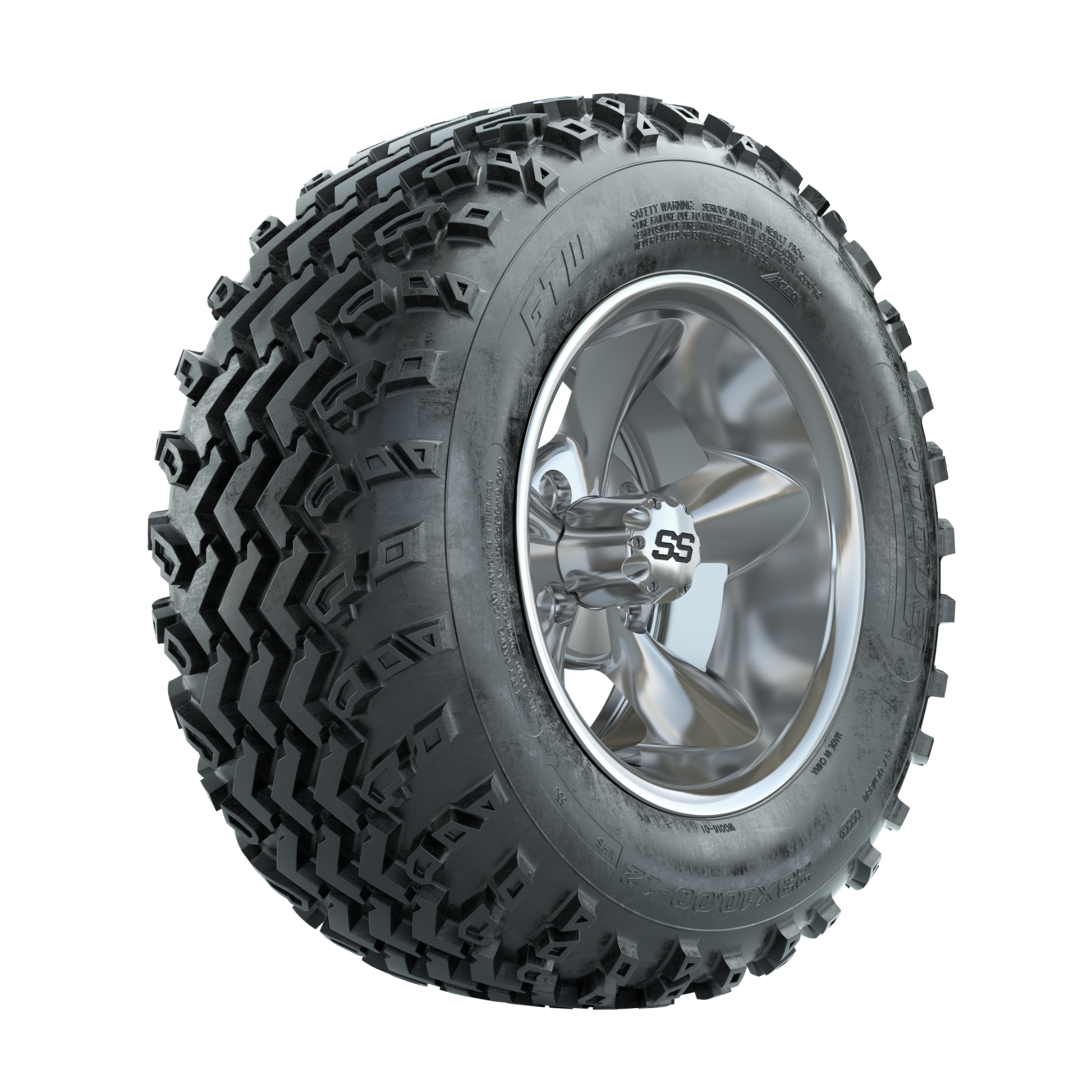 | Product Description: | A set of (4) 12-inch GTW-Godfather Chrome golf cart wheels Mounted on 23x10.00-12 Rogue All-Terrain Tires Tread Classification: All-Terrain Full Tire & Wheel Combo Includes: (4) 12x7 GTW-Godfather Wheels / Chrome finish / Offset: 3:4 (ET -.25) (4) 23x10.00-12 GTW Rogue All-Terrain Tires / Tire is approx. 23- tall (4-Ply) (4) Center caps Please Note: All Wheels are 4 on 4 Hole / Lug Pattern unless otherwise specified. Tech Tips: We Recommend a Minimum 3- Lift Kit for This Tire & Wheel Combo (Tire is approx. 23- OD) Please Check and Adjust PSI in Tires Before Operation (Recommended Inflation Can Be Found on Sidewall of Tire) Tire & Wheel Combos are mounted and Inflated Before Shipping, Free of Charge All Wheels Have a lug pattern of "4x101.6mm" Lug Nuts Sold Separately: Standard Chrome Lug Nuts #LUG4S Metric Chrome Lug Nuts #LUG4M (Yamaha Models) |
