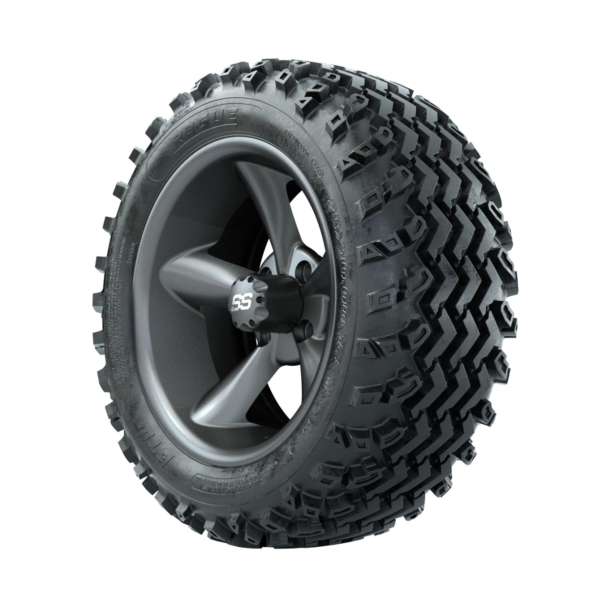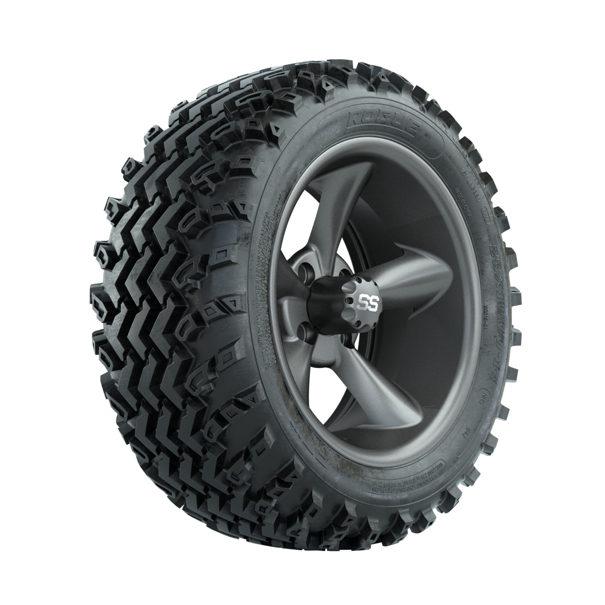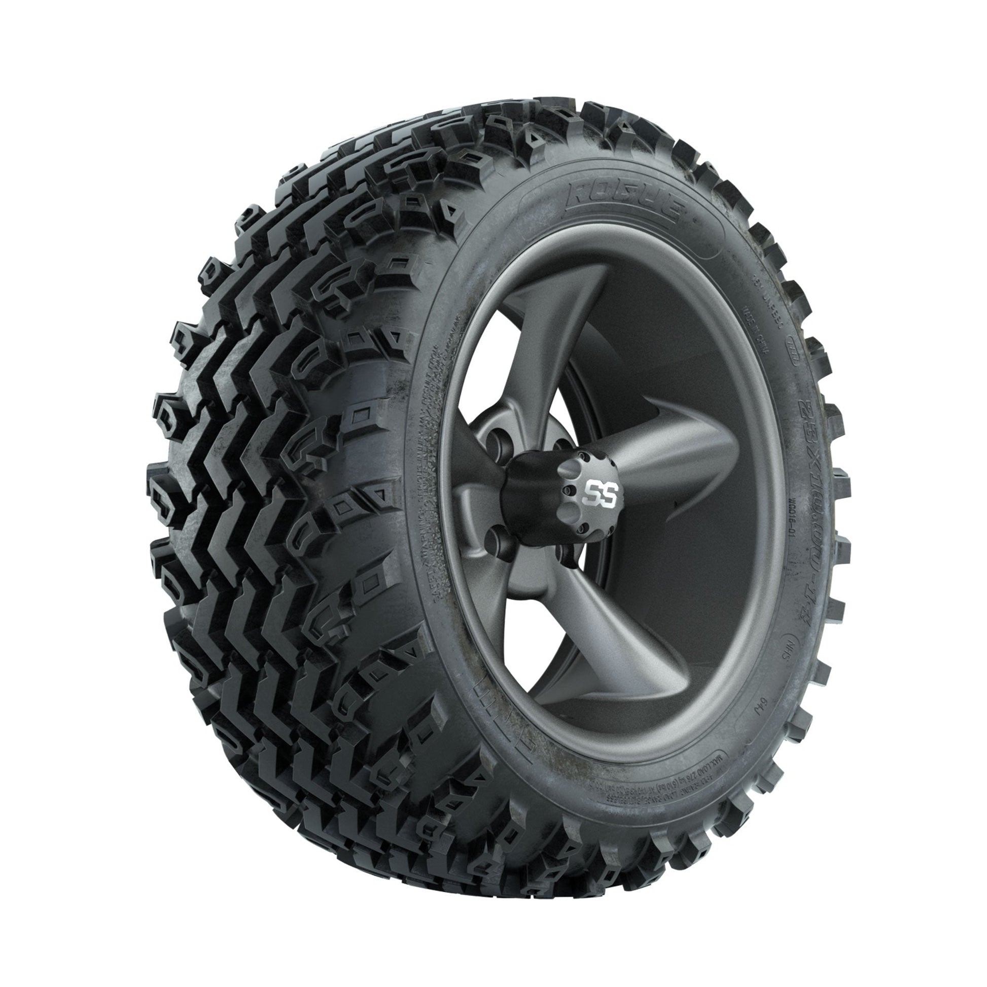| Product Description: | A set of (4) 14-inch GTW-Godfather Matte Grey golf cart wheels Mounted on 23x10.00-14 Rogue All-Terrain Tires Tread Classification: All-Terrain Full Tire & Wheel Combo Includes: (4) 14x7 GTW-Godfather Wheels / Matte Grey finish / Offset: 3:4 (ET -.25) (4) 23x10.00-14 GTW Rogue All-Terrain Tires / Tire is approx. 23- tall (4-Ply) (4) Center caps Please Note: All Wheels are 4 on 4 Hole / Lug Pattern unless otherwise specified. Tech Tips: We Recommend a Minimum 3- Lift Kit for This Tire & Wheel Combo (Tire is approx. 23- OD) Please Check and Adjust PSI in Tires Before Operation (Recommended Inflation Can Be Found on Sidewall of Tire) Tire & Wheel Combos are mounted and Inflated Before Shipping, Free of Charge All Wheels Have a lug pattern of "4x101.6mm" Lug Nuts Sold Separately: Standard Chrome Lug Nuts #LUG4S Metric Chrome Lug Nuts #LUG4M (Yamaha Models) |