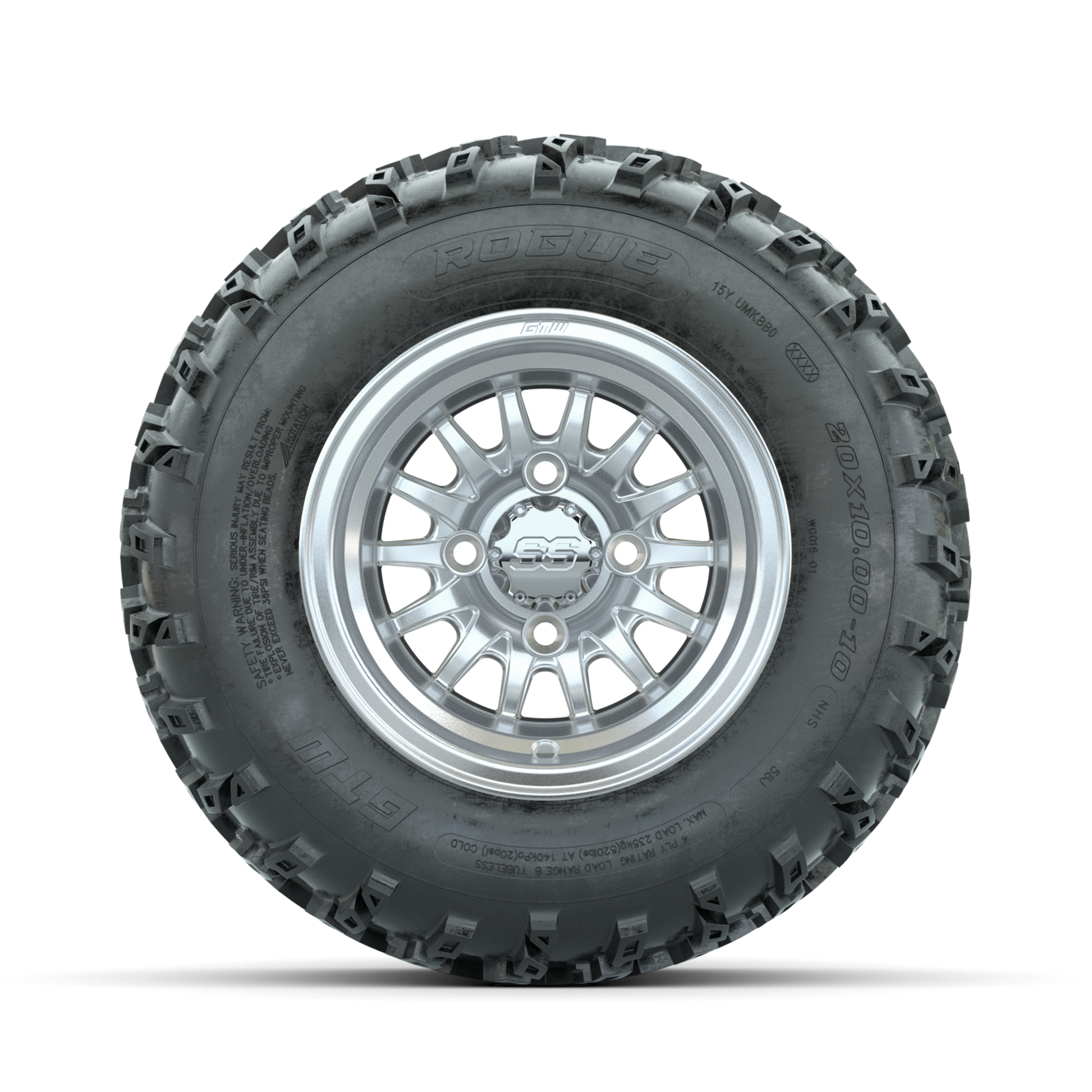 | Product Description: | A set of (4) 10-inch GTW-Medusa Machined/Silver golf cart wheels Mounted on 20x10.00-10 Rogue All-Terrain Tires Tread Classification: All-Terrain Full Tire & Wheel Combo Includes: (4) 10x7 GTW-Medusa Wheels / Machined/Silver finish / Offset: 3:4 (ET -.25) (4) 20x10.00-10 GTW Rogue All-Terrain Tires / Tire is approx. 20- tall (4-Ply) (4) Center caps Please Note: All Wheels are 4 on 4 Hole / Lug Pattern unless otherwise specified. Tech Tips: We Recommend a Minimum 3- Lift Kit for This Tire & Wheel Combo (Tire is approx. 20- OD) Please Check and Adjust PSI in Tires Before Operation (Recommended Inflation Can Be Found on Sidewall of Tire) Tire & Wheel Combos are mounted and Inflated Before Shipping, Free of Charge All Wheels Have a lug pattern of "4x101.6mm" Lug Nuts Sold Separately: Standard Chrome Lug Nuts #LUG4S Metric Chrome Lug Nuts #LUG4M (Yamaha Models) |