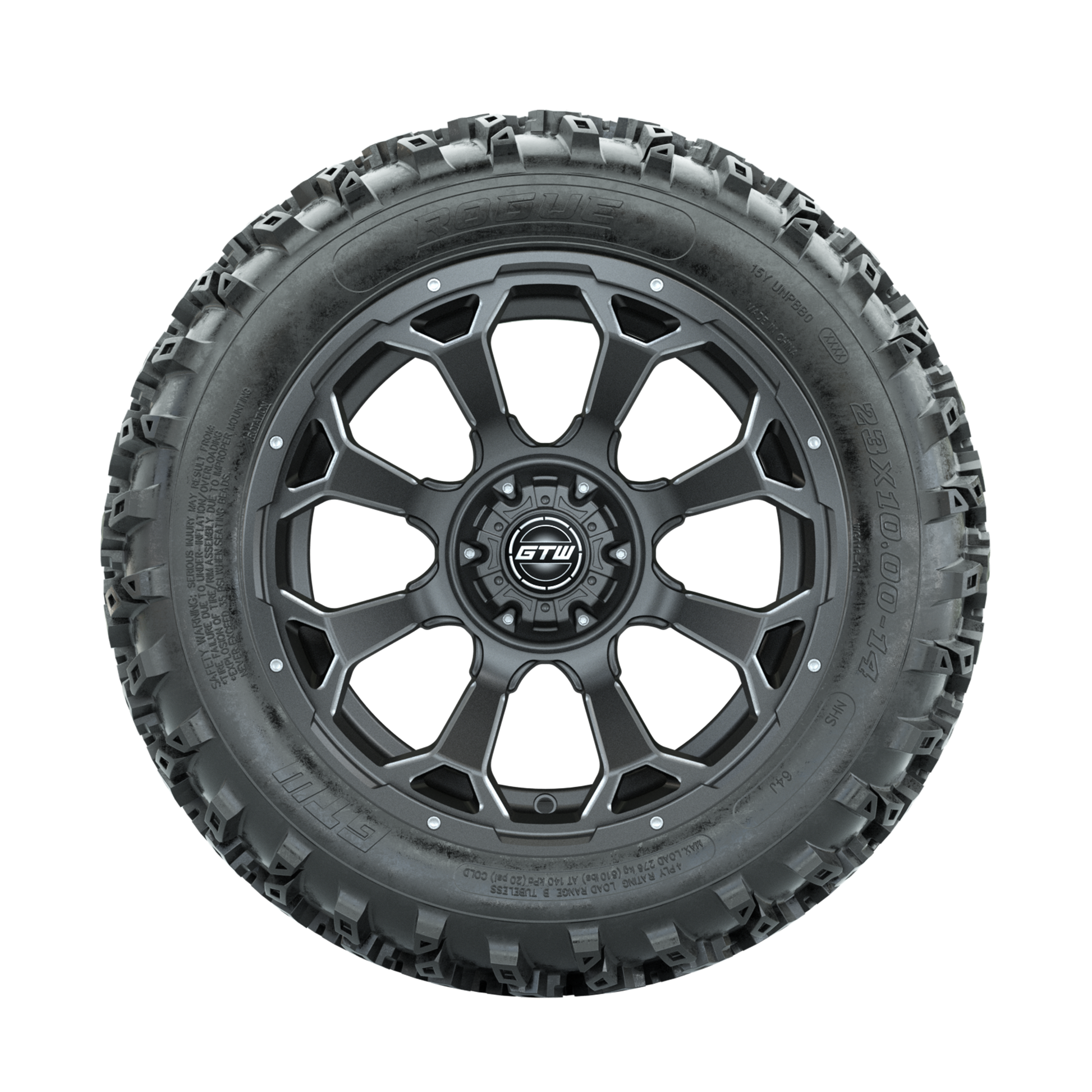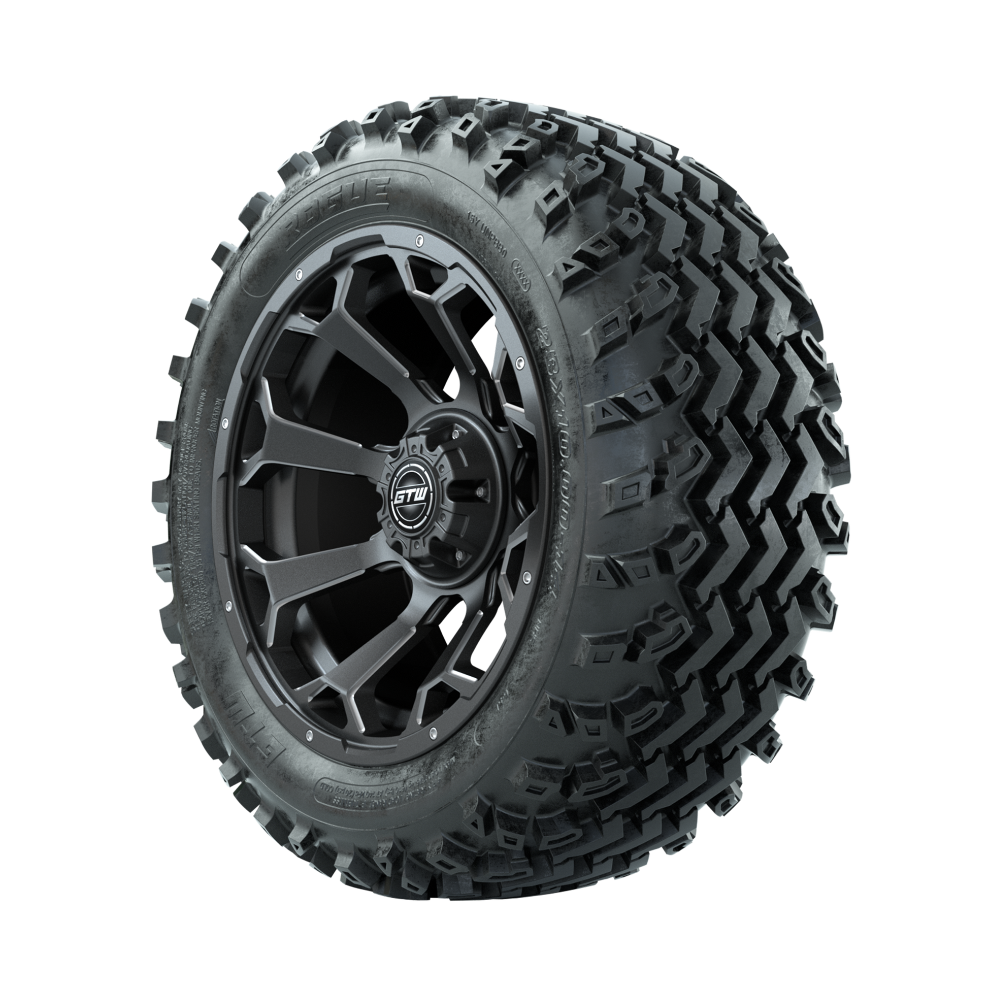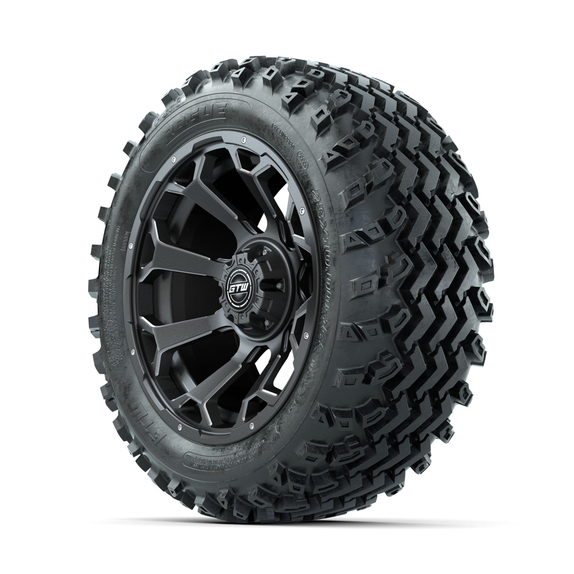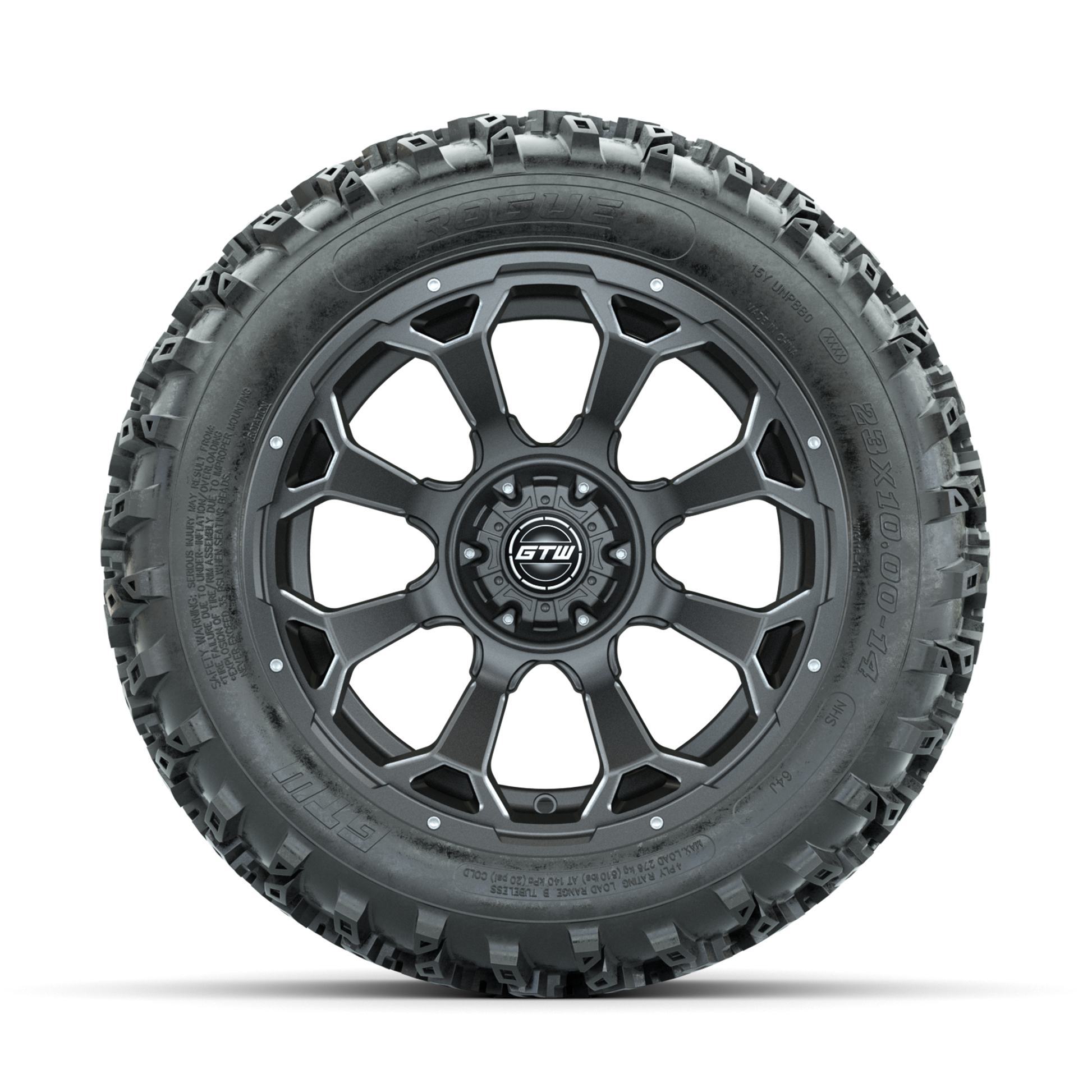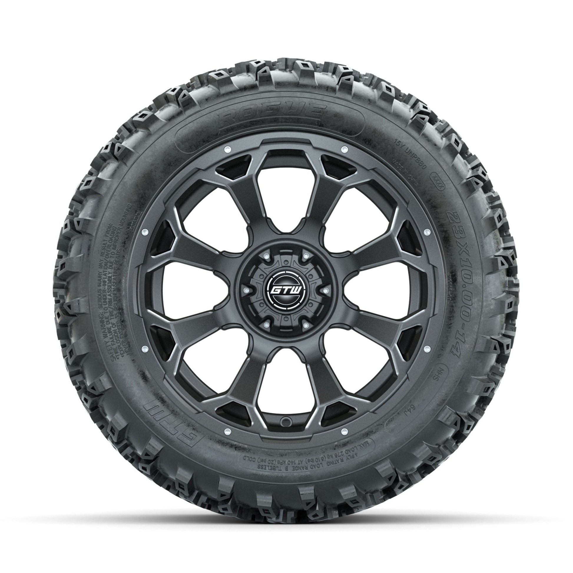 | Product Description: | A set of (4) 14-inch GTW-Raven Ball Milled/Matte Grey golf cart wheels Mounted on 23x10.00-14 Rogue All-Terrain Tires Tread Classification: All-Terrain Full Tire & Wheel Combo Includes: (4) 14x7 GTW-Raven Wheels / Ball Milled/Matte Grey finish / Offset: 3:4 (ET -.25) (4) 23x10.00-14 GTW Rogue All-Terrain Tires / Tire is approx. 23- tall (4-Ply) (4) Center caps Please Note: All Wheels are 4 on 4 Hole / Lug Pattern unless otherwise specified. Tech Tips: We Recommend a Minimum 3- Lift Kit for This Tire & Wheel Combo (Tire is approx. 23- OD) Please Check and Adjust PSI in Tires Before Operation (Recommended Inflation Can Be Found on Sidewall of Tire) Tire & Wheel Combos are mounted and Inflated Before Shipping, Free of Charge All Wheels Have a lug pattern of "4x101.6mm" Lug Nuts Sold Separately: Standard Chrome Lug Nuts #LUG4S Metric Chrome Lug Nuts #LUG4M (Yamaha Models) |