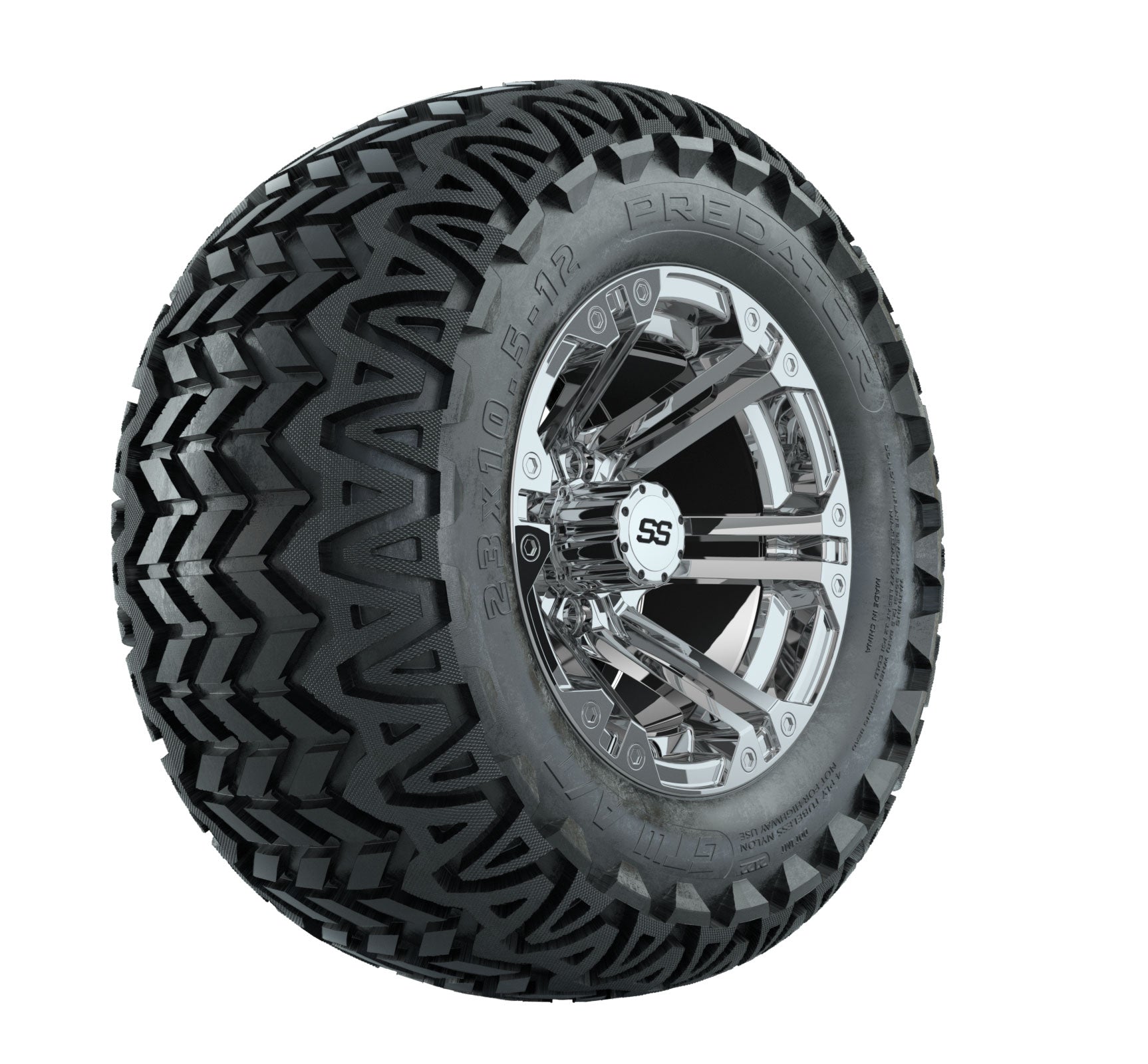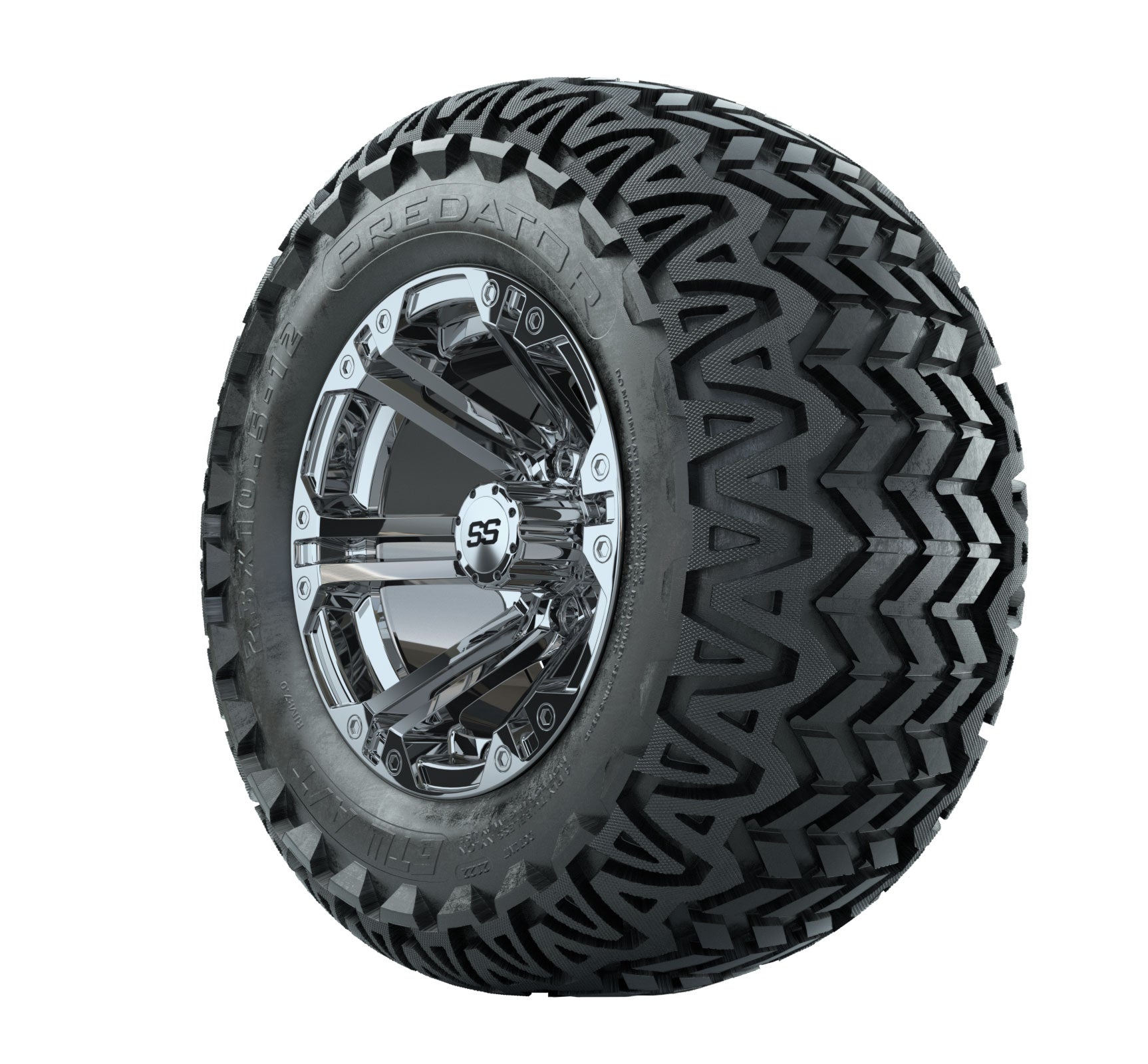| Product Description: | A set of (4) 12-inch Specter chrome finish lifted golf cart wheels on 23-inch A/T tires Tread Classification : All-Terrain / Off-Road Full kit includes : (4) 12" Specter Chrome Wheels / Offset: 3:4 (ET -.25) (4) 23" Predator A/T Tires (4-Ply) (4) center caps Please Note: All Wheels are 4 on 4 Hole / Lug Pattern unless otherwise specified. Tech Tips: This Tire & Wheel Combo Requires a Lift Kit Tire & Wheel Combos are mounted and Inflated Before Shipping, Free of Charge Please Check and Adjust PSI in Tires Before Operation (Recommended Inflation Can Be Found on Sidewall of Tire) All Wheels Have a lug pattern of "4x101.6mm" Lug Nuts Sold Separately: Standard Chrome Lug Nuts #LUG4S Metric Chrome Lug Nuts #LUG4M (Yamaha Models) Club Car Precedent / Onward / Tempo require a low pro lift kit for any 12- or larger TWA combos (#95560 Jake-s Lo Pro Lift) |