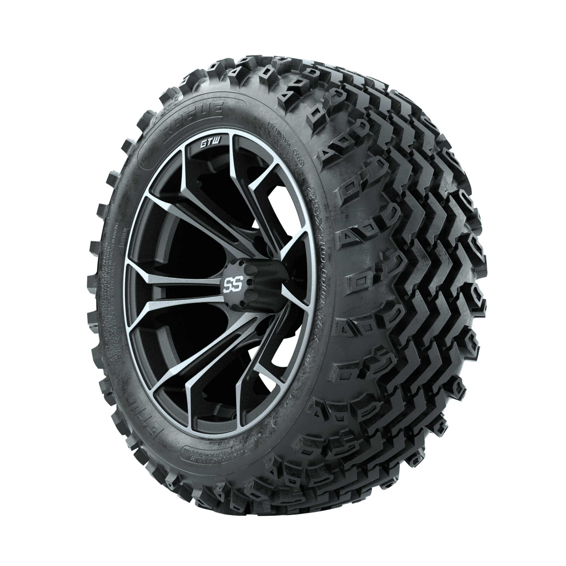 | Product Description: | A set of (4) 14-inch GTW-Spyder Machined/Grey golf cart wheels Mounted on 23x10.00-14 Rogue All-Terrain Tires Tread Classification: All-Terrain Full Tire & Wheel Combo Includes: (4) 14x7 GTW-Spyder Wheels / Machined/Grey finish / Offset: 3:4 (ET -.25) (4) 23x10.00-14 GTW Rogue All-Terrain Tires / Tire is approx. 23- tall (4-Ply) (4) Center caps Please Note: All Wheels are 4 on 4 Hole / Lug Pattern unless otherwise specified. Tech Tips: We Recommend a Minimum 3- Lift Kit for This Tire & Wheel Combo (Tire is approx. 23- OD) Please Check and Adjust PSI in Tires Before Operation (Recommended Inflation Can Be Found on Sidewall of Tire) Tire & Wheel Combos are mounted and Inflated Before Shipping, Free of Charge All Wheels Have a lug pattern of "4x101.6mm" Lug Nuts Sold Separately: Standard Chrome Lug Nuts #LUG4S Metric Chrome Lug Nuts #LUG4M (Yamaha Models) |