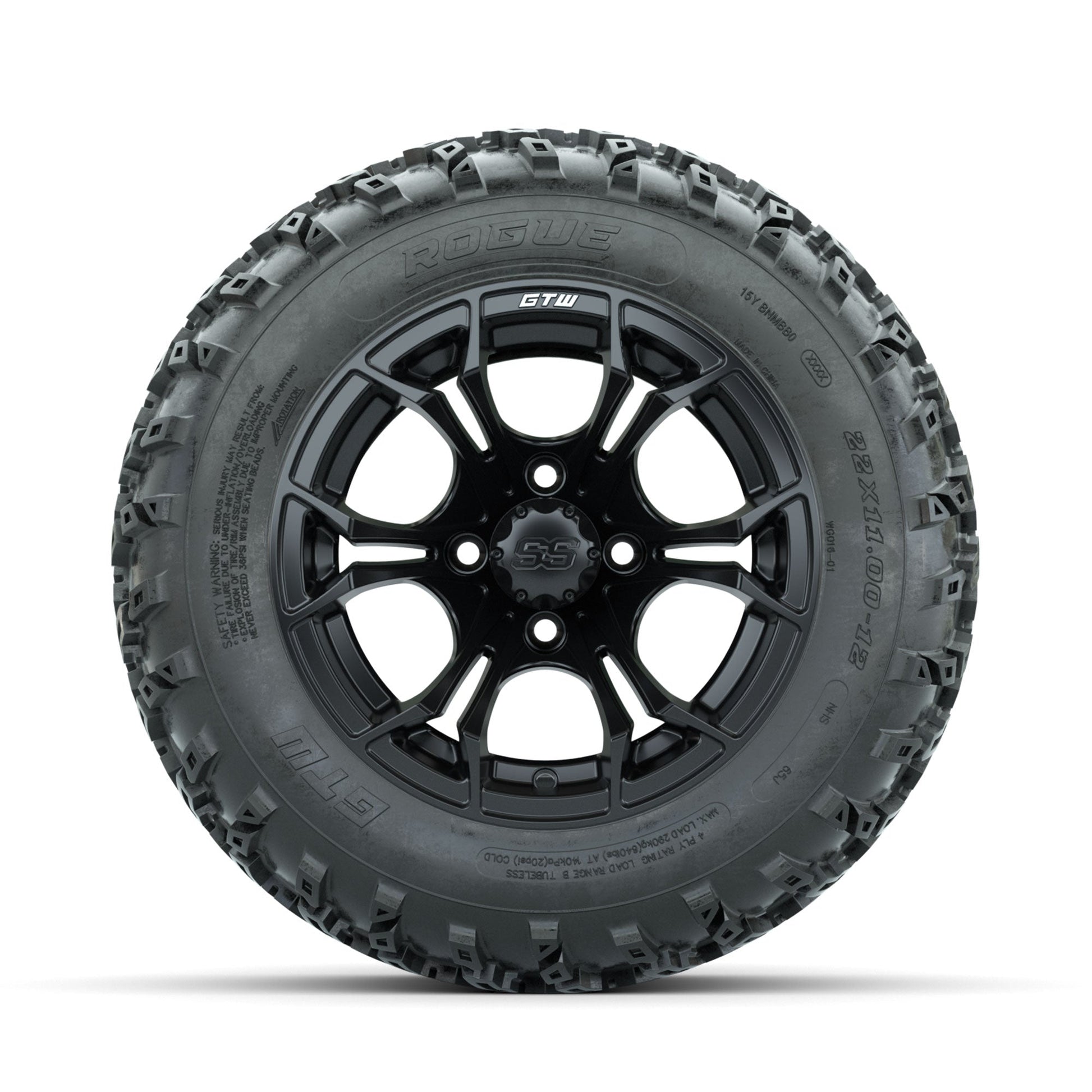 | Product Description: | A set of (4) 12-inch GTW-Spyder Matte Black golf cart wheels Mounted on 22x11.00-12 Rogue All-Terrain Tires Tread Classification: All-Terrain Full Tire & Wheel Combo Includes: (4) 12x7 GTW-Spyder Wheels / Matte Black finish / Offset: 3:4 (ET -.25) (4) 22x11.00-12 GTW Rogue All-Terrain Tires / Tire is approx. 22- tall (4-Ply) (4) Center caps Please Note: All Wheels are 4 on 4 Hole / Lug Pattern unless otherwise specified. Tech Tips: We Recommend a Minimum 3- Lift Kit for This Tire & Wheel Combo (Tire is approx. 22- OD) Please Check and Adjust PSI in Tires Before Operation (Recommended Inflation Can Be Found on Sidewall of Tire) Tire & Wheel Combos are mounted and Inflated Before Shipping, Free of Charge All Wheels Have a lug pattern of "4x101.6mm" Lug Nuts Sold Separately: Standard Chrome Lug Nuts #LUG4S Metric Chrome Lug Nuts #LUG4M (Yamaha Models) |