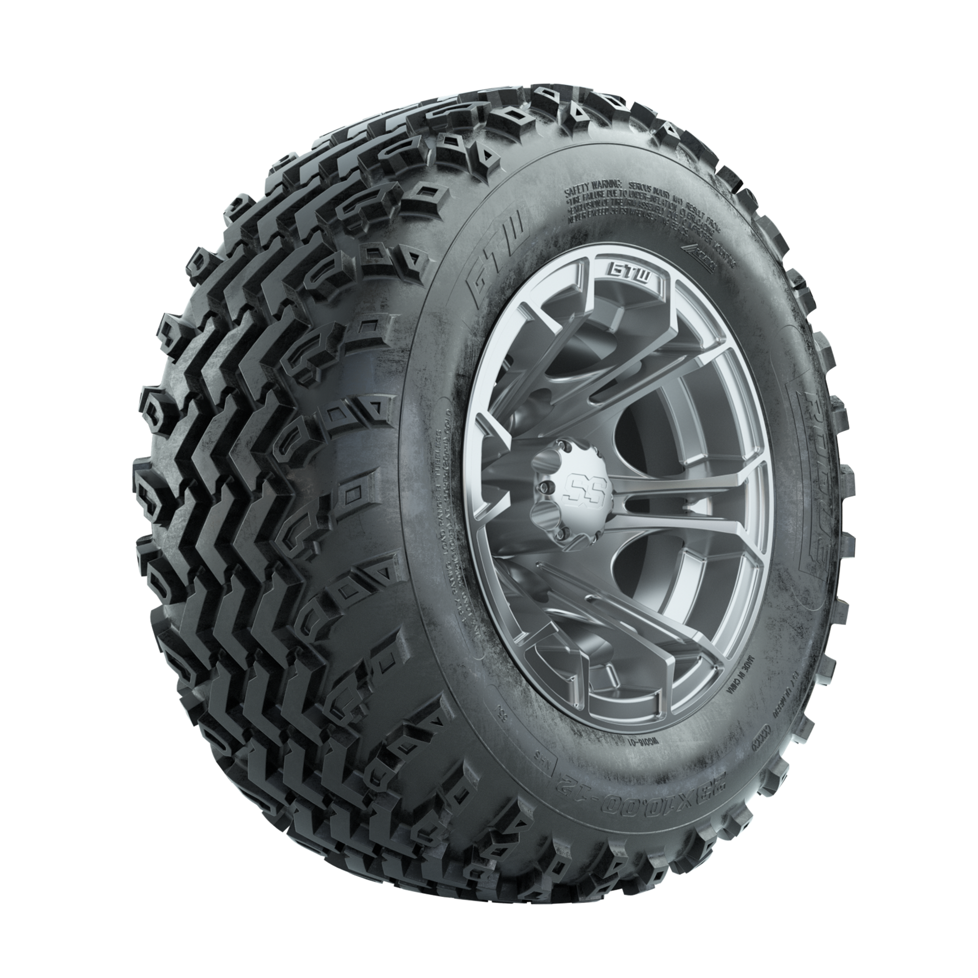 | Product Description: | A set of (4) 12-inch GTW-Spyder Silver golf cart wheels Mounted on 23x10.00-12 Rogue All-Terrain Tires Tread Classification: All-Terrain Full Tire & Wheel Combo Includes: (4) 12x7 GTW-Spyder Wheels / Silver finish / Offset: 3:4 (ET -.25) (4) 23x10.00-12 GTW Rogue All-Terrain Tires / Tire is approx. 23- tall (4-Ply) (4) Center caps Please Note: All Wheels are 4 on 4 Hole / Lug Pattern unless otherwise specified. Tech Tips: We Recommend a Minimum 3- Lift Kit for This Tire & Wheel Combo (Tire is approx. 23- OD) Please Check and Adjust PSI in Tires Before Operation (Recommended Inflation Can Be Found on Sidewall of Tire) Tire & Wheel Combos are mounted and Inflated Before Shipping, Free of Charge All Wheels Have a lug pattern of "4x101.6mm" Lug Nuts Sold Separately: Standard Chrome Lug Nuts #LUG4S Metric Chrome Lug Nuts #LUG4M (Yamaha Models) |