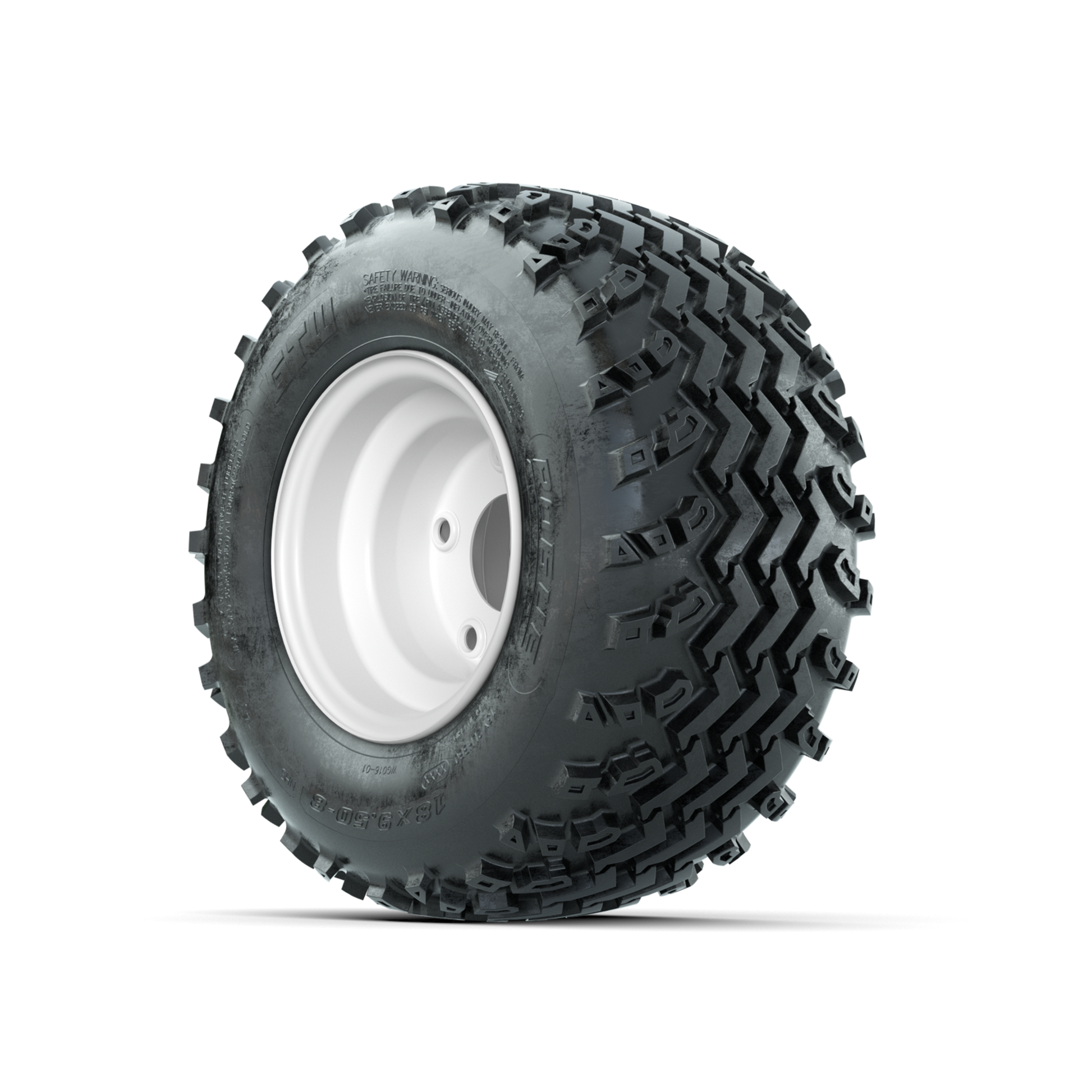 | Product Description: | A set of (4) 8-inch GTW-Steel White Centered 5-Hole golf cart wheels Mounted on 18x9.50-8 Rogue All-Terrain Tires Tread Classification: All-Terrain Full Tire & Wheel Combo Includes: (4) 8x7 GTW-Steel Wheels (Centered 5-Hole) / White finish (4) 18x9.50-8 GTW Rogue All-Terrain Tires / Tire is approx. 18- tall (4-Ply) Reuse Stock Lugs Please Note: All Wheels are 4 on 4 Hole / Lug Pattern unless otherwise specified. Tech Tips: No Lift Kit Required for This Tire & Wheel Combo (Tire is approx. 18- OD) Please Check and Adjust PSI in Tires Before Operation (Recommended Inflation Can Be Found on Sidewall of Tire) Tire & Wheel Combos are mounted and Inflated Before Shipping, Free of Charge All Wheels Have a lug pattern of "4x101.6mm" Lug Nuts Sold Separately: Standard Chrome Lug Nuts #LUG4S Metric Chrome Lug Nuts #LUG4M (Yamaha Models) |