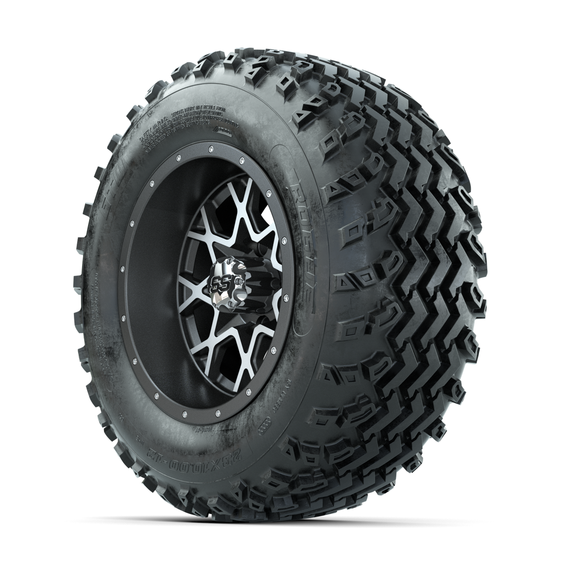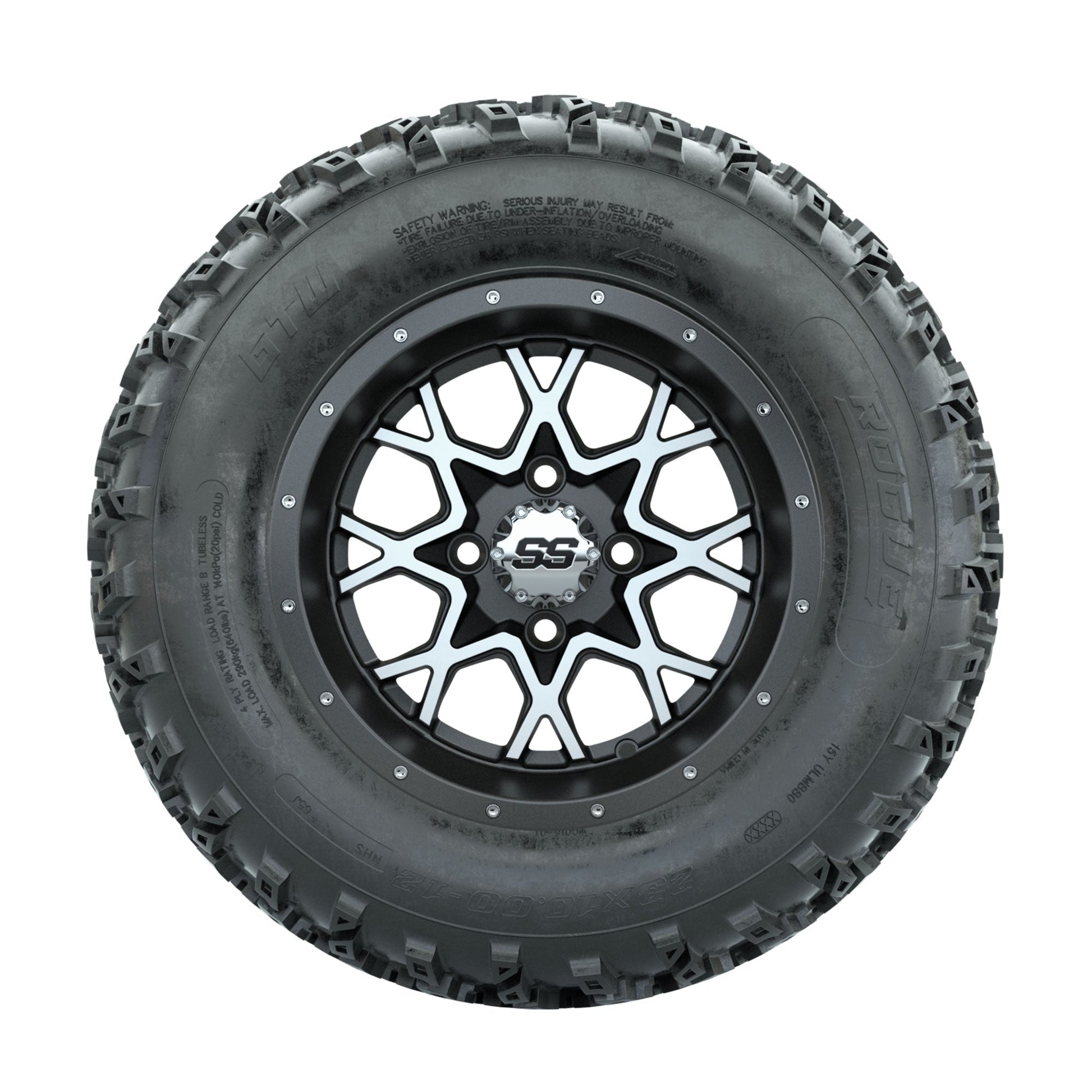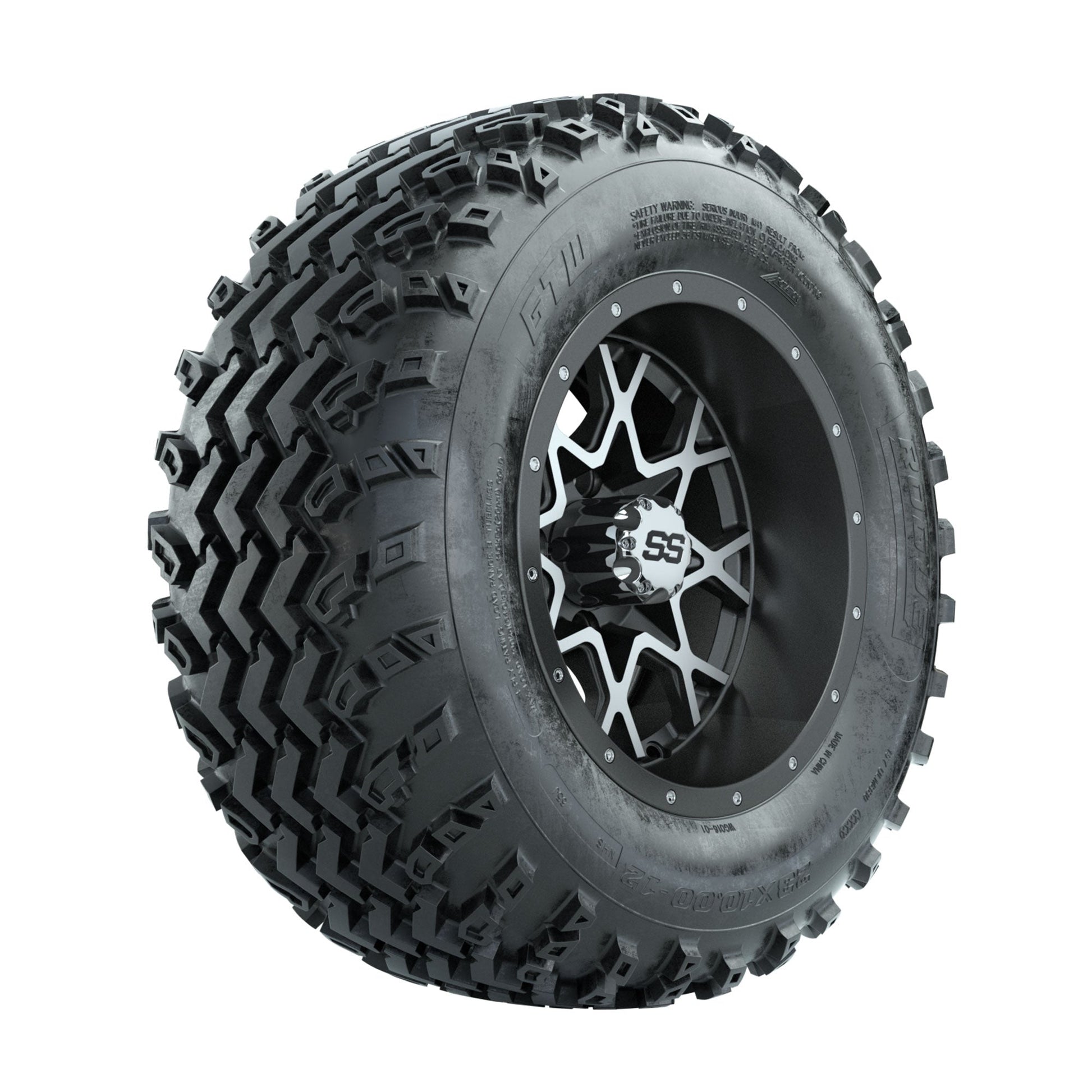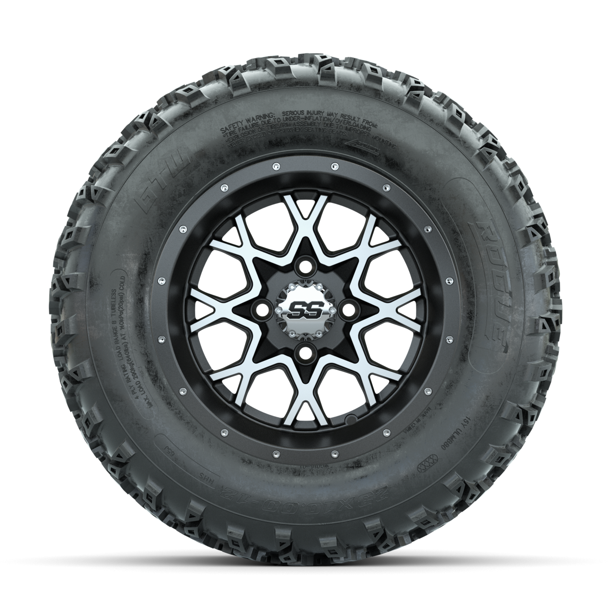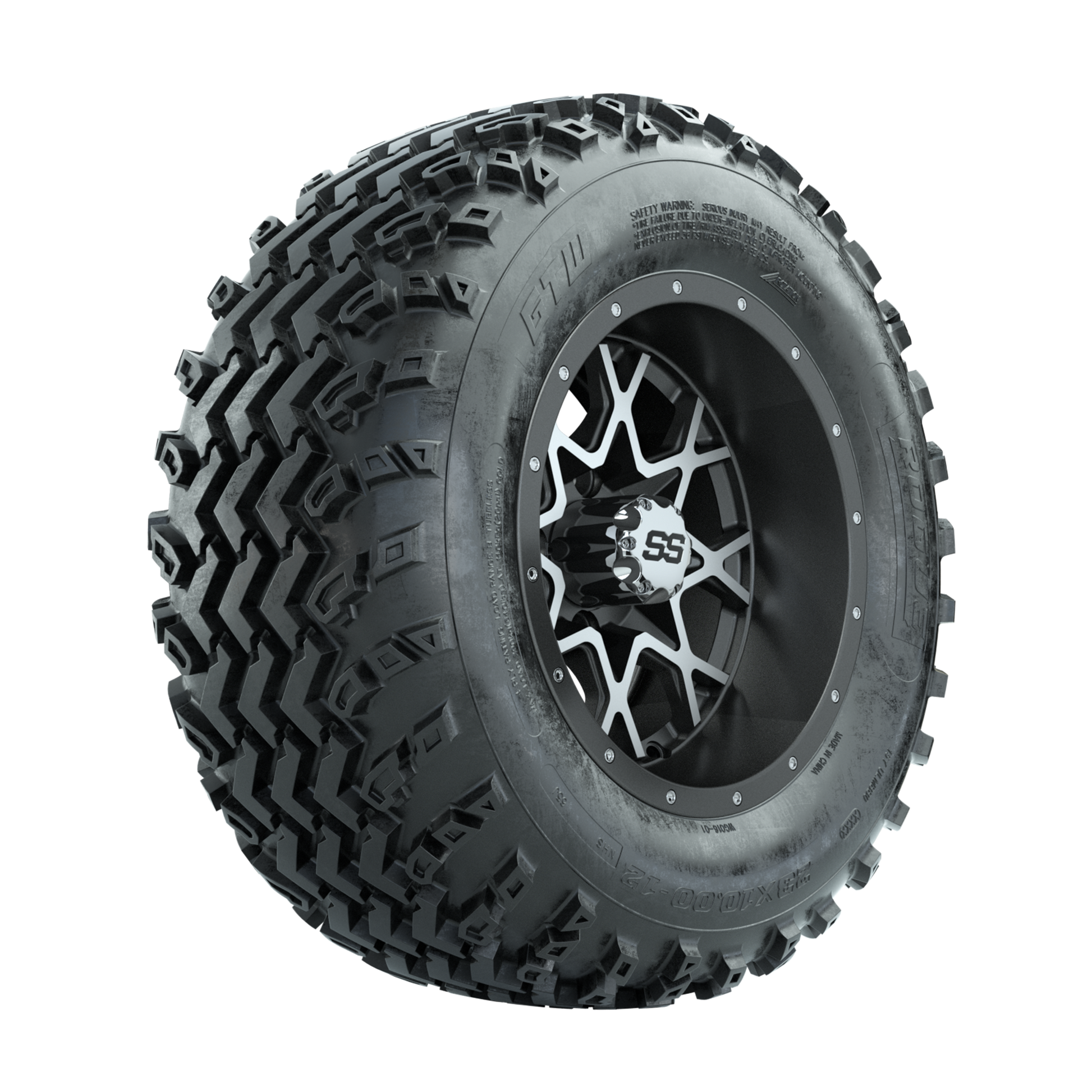 | Product Description: | A set of (4) 12-inch GTW-Vortex Machined/Matte Grey golf cart wheels Mounted on 23x10.00-12 Rogue All-Terrain Tires Tread Classification: All-Terrain Full Tire & Wheel Combo Includes: (4) 12x7 GTW-Vortex Wheels / Machined/Matte Grey finish / Offset: 3:4 (ET -.25) (4) 23x10.00-12 GTW Rogue All-Terrain Tires / Tire is approx. 23- tall (4-Ply) (4) Center caps Please Note: All Wheels are 4 on 4 Hole / Lug Pattern unless otherwise specified. Tech Tips: We Recommend a Minimum 3- Lift Kit for This Tire & Wheel Combo (Tire is approx. 23- OD) Please Check and Adjust PSI in Tires Before Operation (Recommended Inflation Can Be Found on Sidewall of Tire) Tire & Wheel Combos are mounted and Inflated Before Shipping, Free of Charge All Wheels Have a lug pattern of "4x101.6mm" Lug Nuts Sold Separately: Standard Chrome Lug Nuts #LUG4S Metric Chrome Lug Nuts #LUG4M (Yamaha Models) |