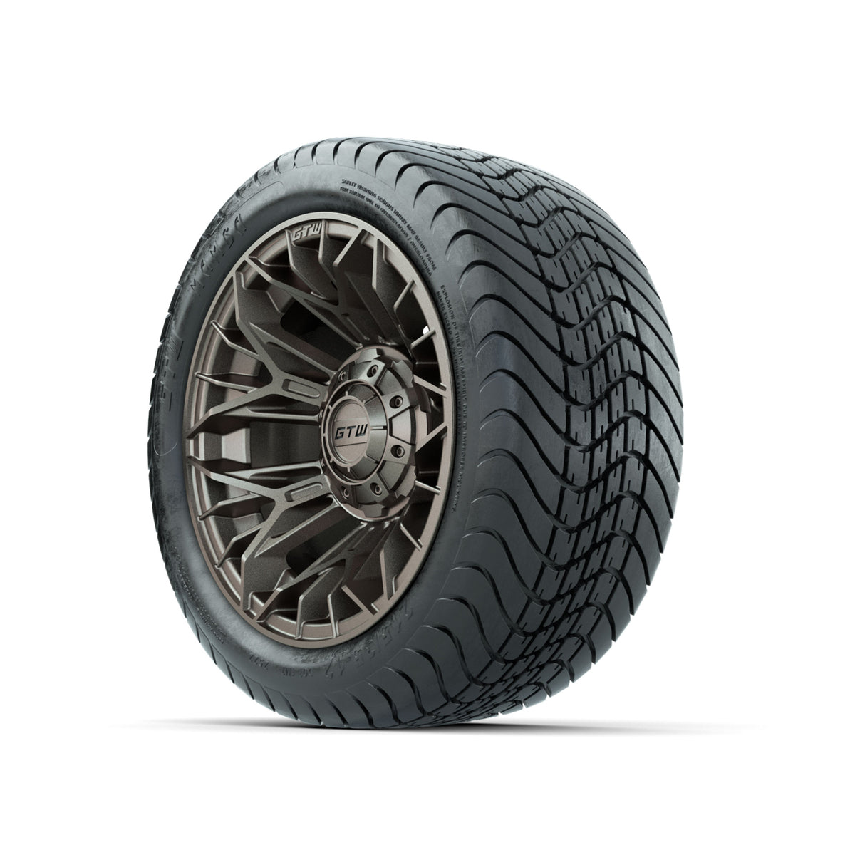A set of (4) 12-inch GTW® Stellar Matte Bronze golf cart wheels on 215/35-12 (18-Inch) GTW® Mamba Street Tires