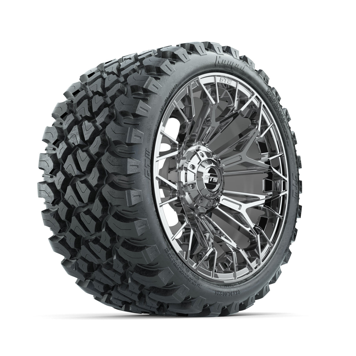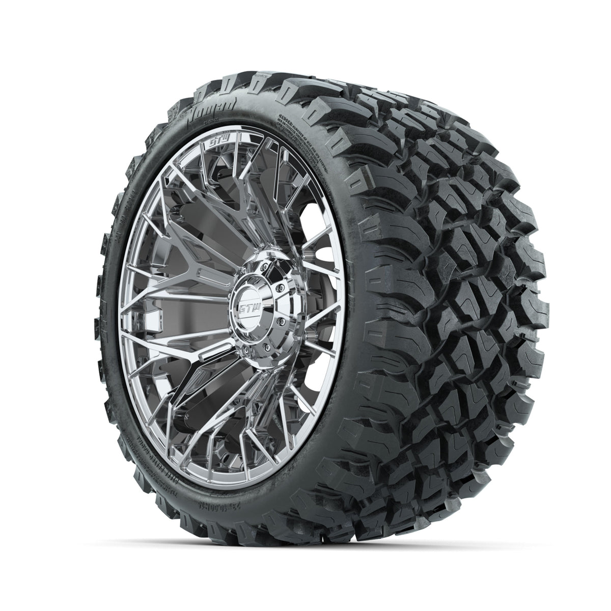 A set of (4) 15-inch GTW® Stellar Chrome golf cart wheels on 23x10-R15 GTW® Nomad Steel Belted Radial All-Terrain Tires