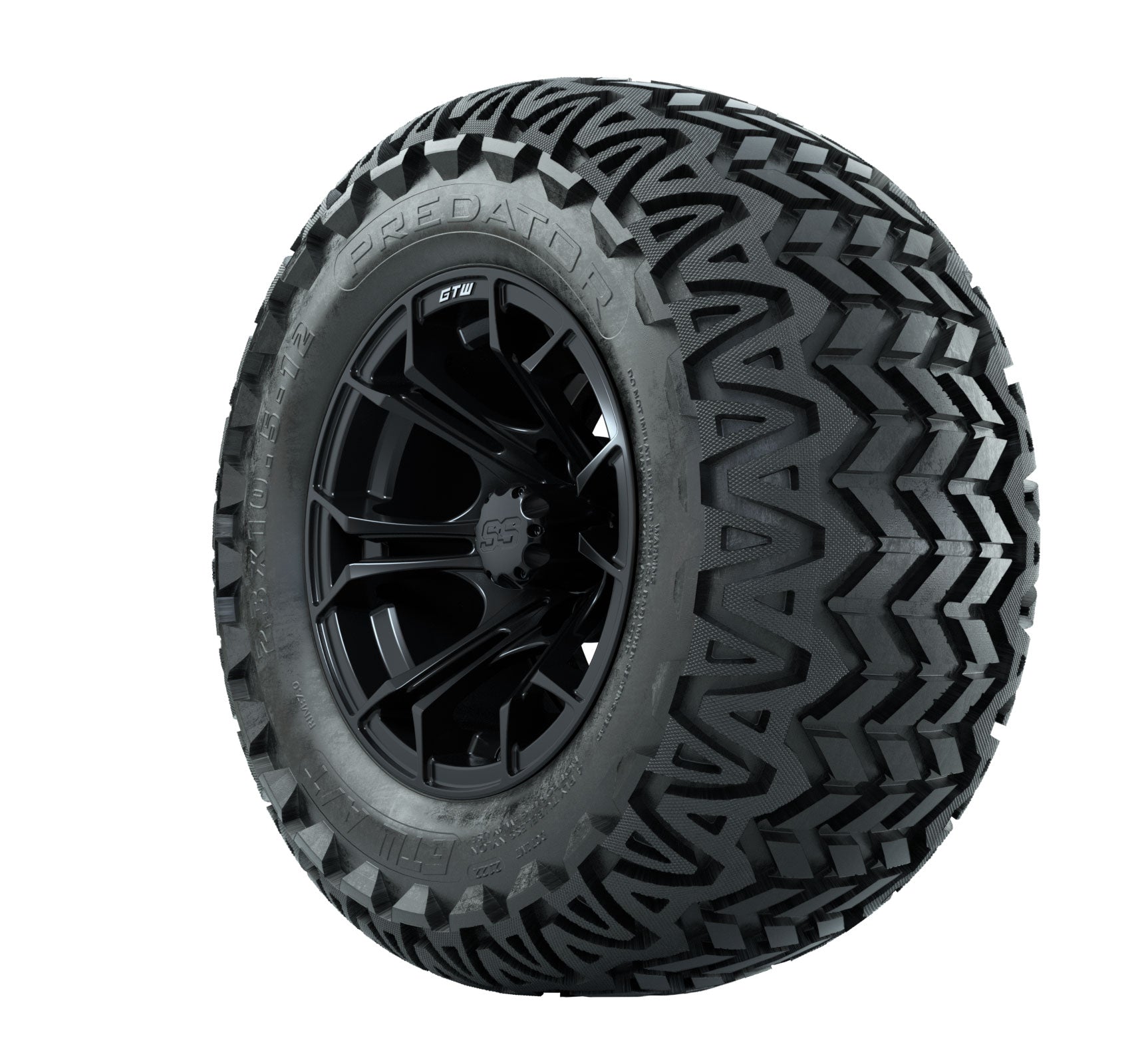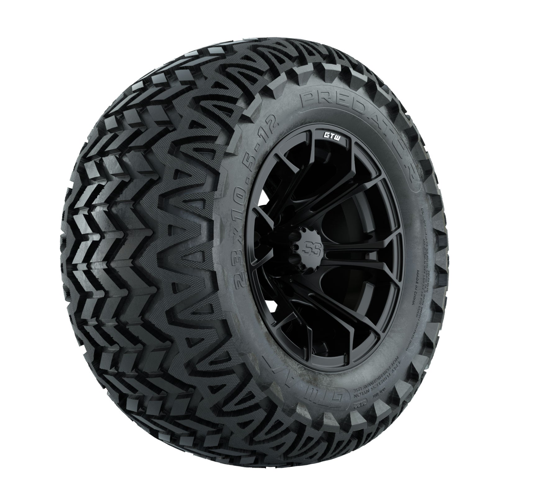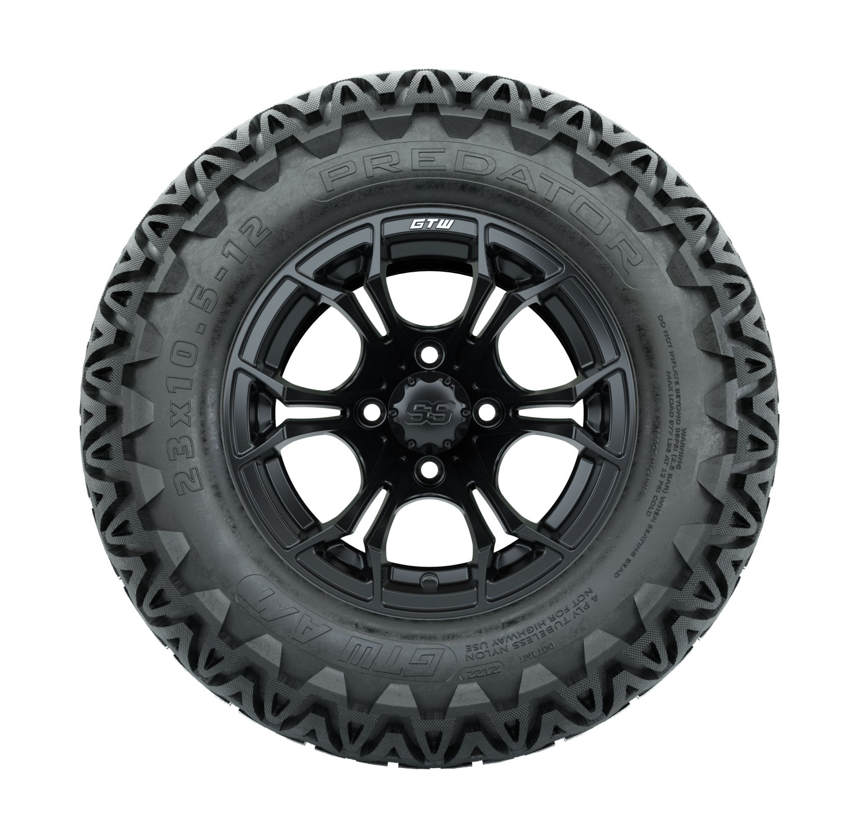 | Product Description: | A set of (4) 12-inch Spyder matte black lifted golf cart wheels on 23-inch A/T tires Tread Classification : All-Terrain / Off-Road Full kit includes : (4) 12" Spyder Matte Black Wheels / Offset: 3:4 (ET -.25) (4) 23" Predator A/T Tires (4-Ply) (4) center caps Please Note: All Wheels are 4 on 4 Hole / Lug Pattern unless otherwise specified. Tech Tips: This Tire & Wheel Combo Requires a Lift Kit Tire & Wheel Combos are mounted and Inflated Before Shipping, Free of Charge Please Check and Adjust PSI in Tires Before Operation (Recommended Inflation Can Be Found on Sidewall of Tire) All Wheels Have a lug pattern of "4x101.6mm" Lug Nuts Sold Separately: Standard Chrome Lug Nuts #LUG4S Metric Chrome Lug Nuts #LUG4M (Yamaha Models) Club Car Precedent / Onward / Tempo require a low pro lift kit for any 12- or larger TWA combos (#95560 Jake-s Lo Pro Lift) |