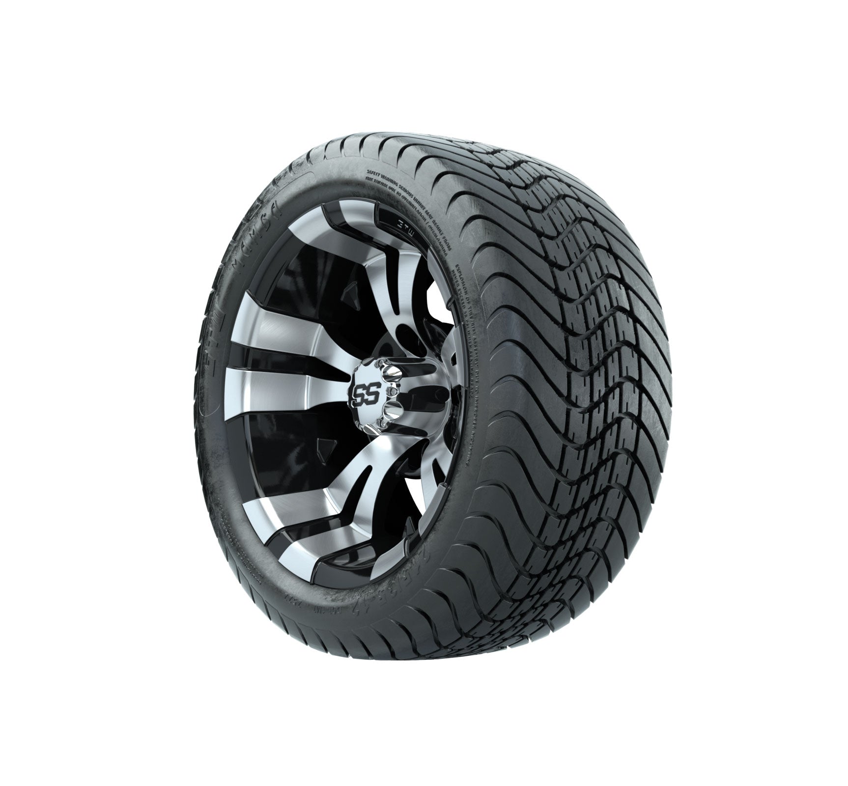 | Product Description: | A set of (4) 12-inch Vampire black/machined golf cart wheels on 215/35-12 (18-inch) tires Tread Classification : Street / Golf Course Full kit includes : (4) 12" Vampire Black/Machined Wheels / Offset: 3:4 (ET -.25) (4) 215/35-12 Mamba Street tires (4-Ply) (4) center caps Please Note: All Wheels are 4 on 4 Hole / Lug Pattern unless otherwise specified. Tech Tips: This Tire & Wheel Combo Does Not Require a Lift Kit Tire & Wheel Combos are mounted and Inflated Before Shipping, Free of Charge Please Check and Adjust PSI in Tires Before Operation (Recommended Inflation Can Be Found on Sidewall of Tire) All Wheels Have a lug pattern of "4x101.6mm" Lug Nuts Sold Separately: Standard Chrome Lug Nuts #LUG4S Metric Chrome Lug Nuts #LUG4M (Yamaha Models) Club Car Precedent / Onward / Tempo require a low pro lift kit for any 12- or larger TWA combos (#95560 Jake-s Lo Pro Lift) |