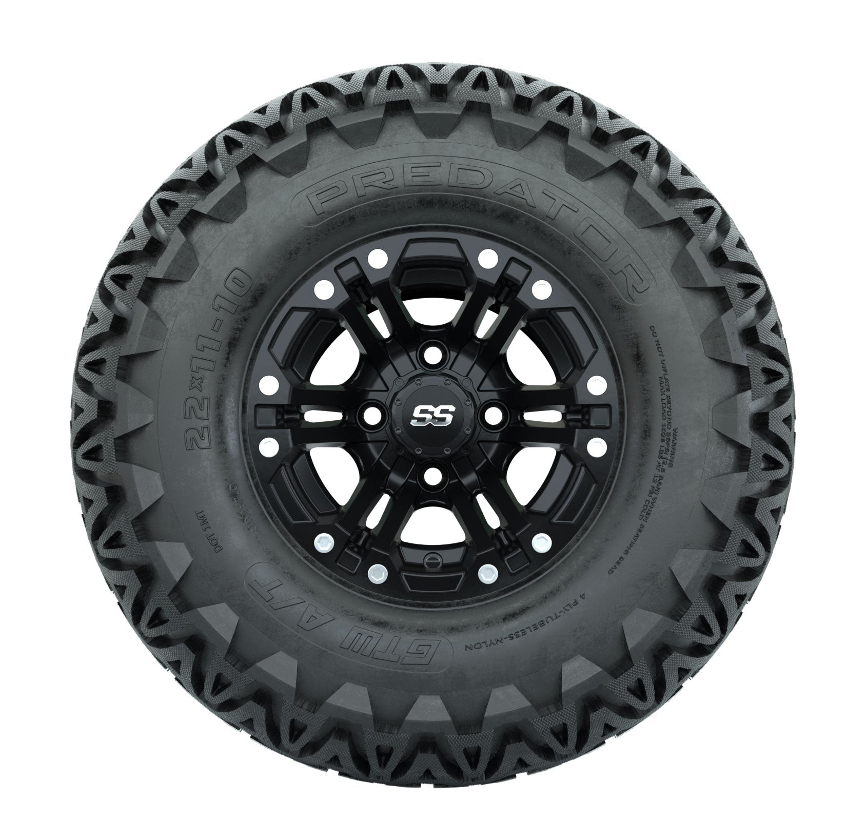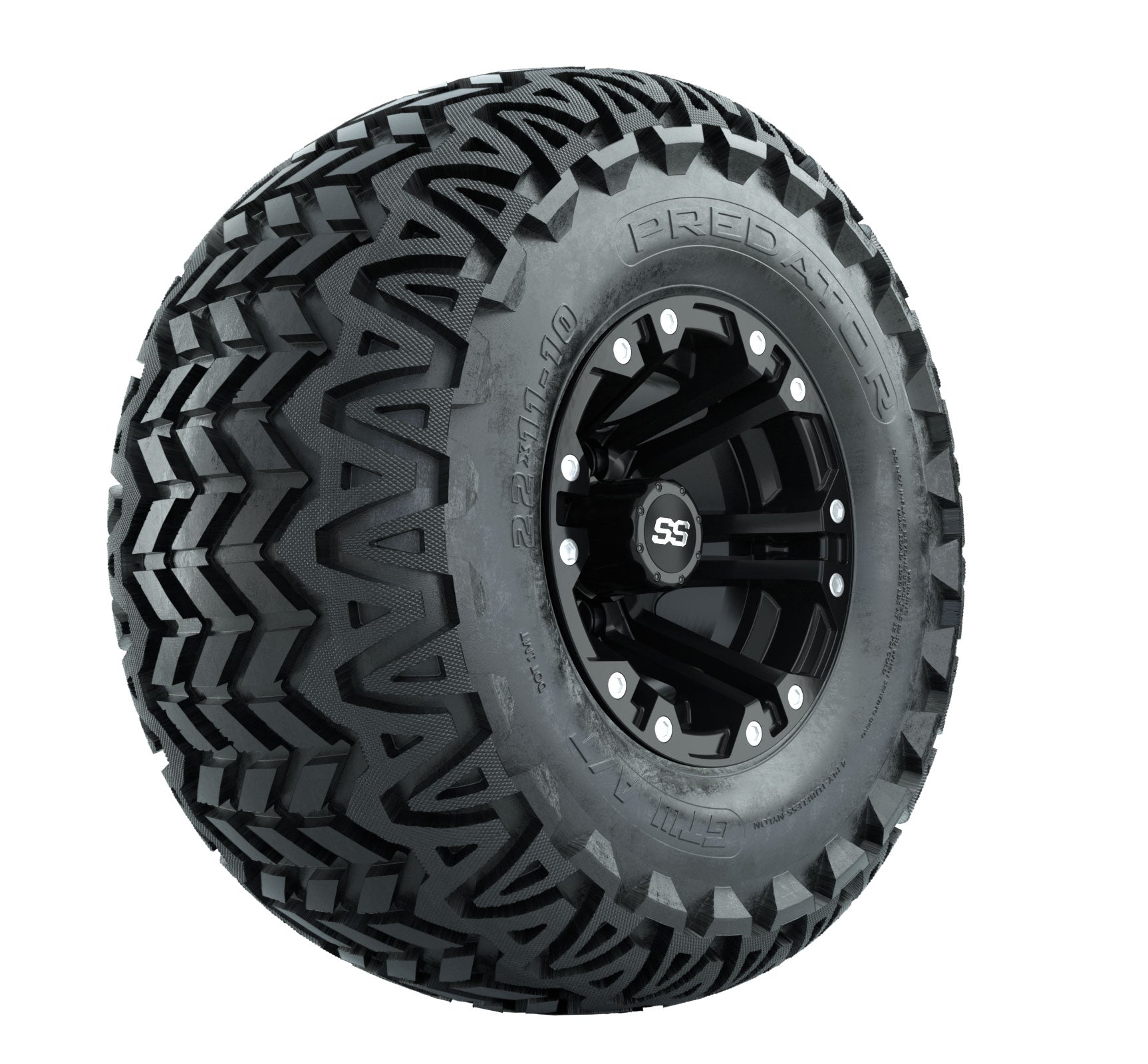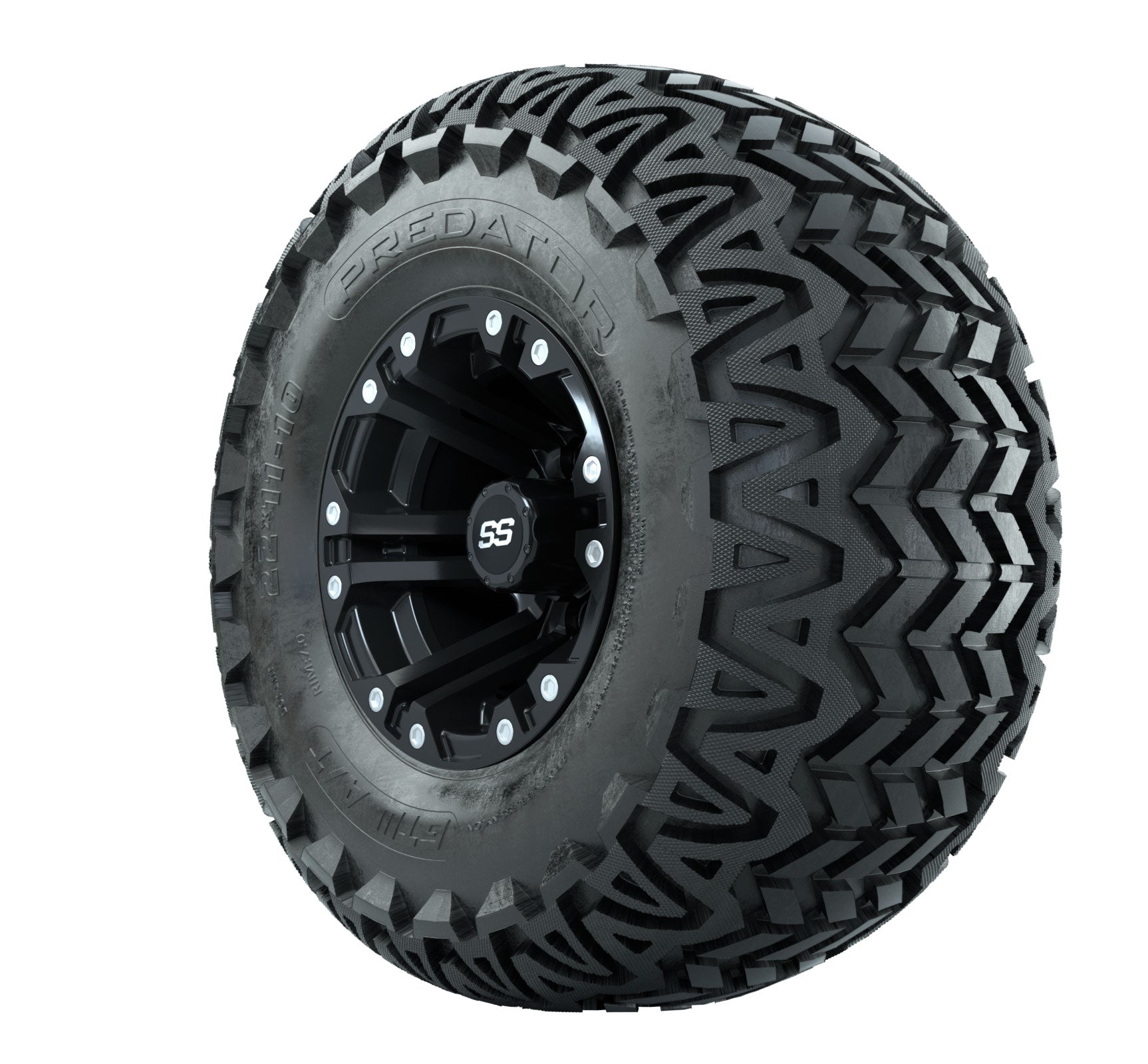 | Product Description: | A set of (4) 10-inch Specter matte black lifted golf cart wheels on 22-inch A/T tires Tread Classification : All-Terrain / Off-Road Full kit includes : (4) 10" Specter Matte Black Wheels / Offset: 3:4 (ET -.25) (4) 22" Predator A/T Tires (4-Ply) (4) center caps Please Note: All Wheels are 4 on 4 Hole / Lug Pattern unless otherwise specified. Tech Tips: This Tire & Wheel Combo Requires a Lift Kit Tire & Wheel Combos are mounted and Inflated Before Shipping, Free of Charge Please Check and Adjust PSI in Tires Before Operation (Recommended Inflation Can Be Found on Sidewall of Tire) All Wheels Have a lug pattern of "4x101.6mm" Lug Nuts Sold Separately: Standard Chrome Lug Nuts #LUG4S Metric Chrome Lug Nuts #LUG4M (Yamaha Models) Club Car Precedent / Onward / Tempo require a low pro lift kit for any 12- or larger TWA combos (#95560 Jake-s Lo Pro Lift) Please Note: Tire and Wheel Ships Fully Mounted, Inflated, and Ready for Installation (*Please check PSI upon installation prior to operating) - Lug Nuts Sold Separately |