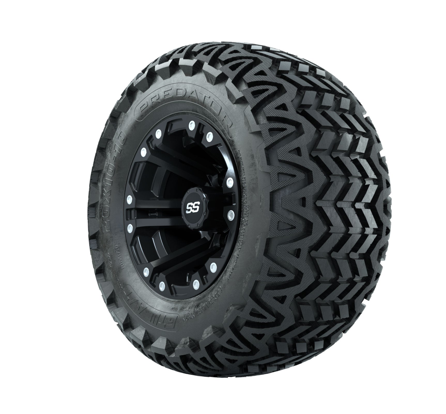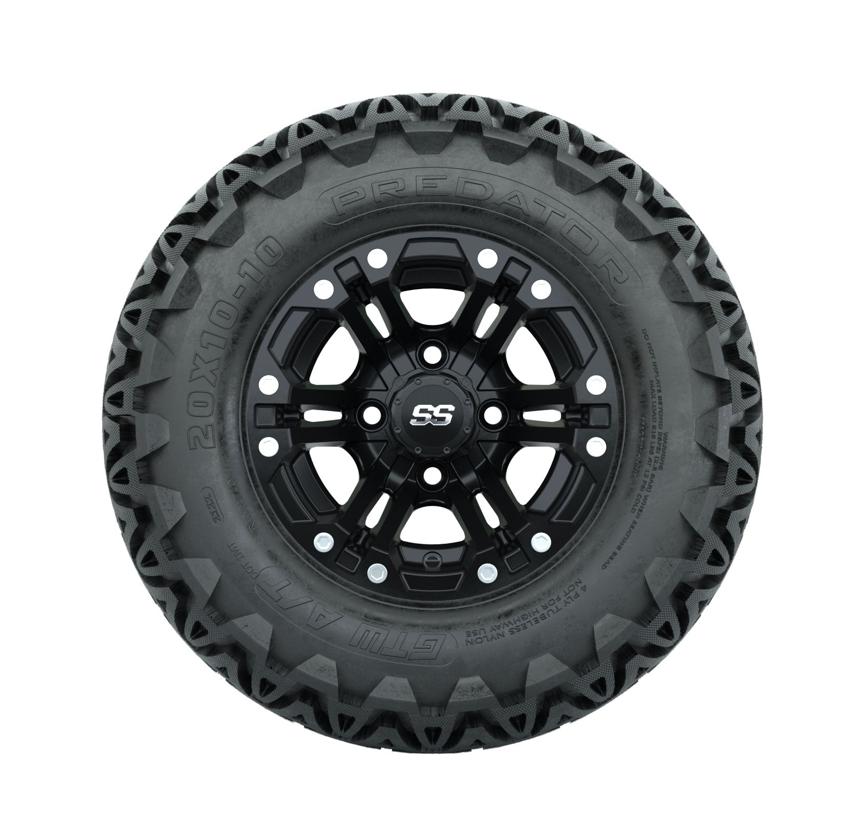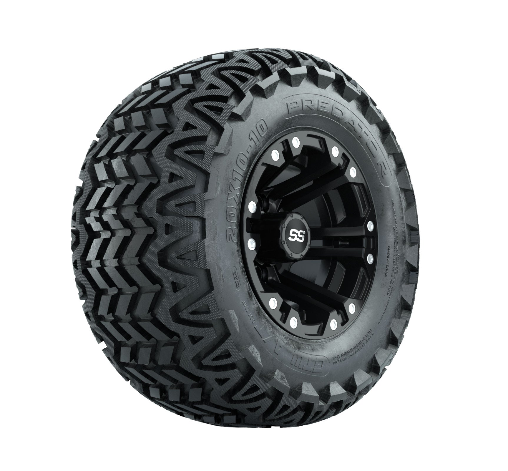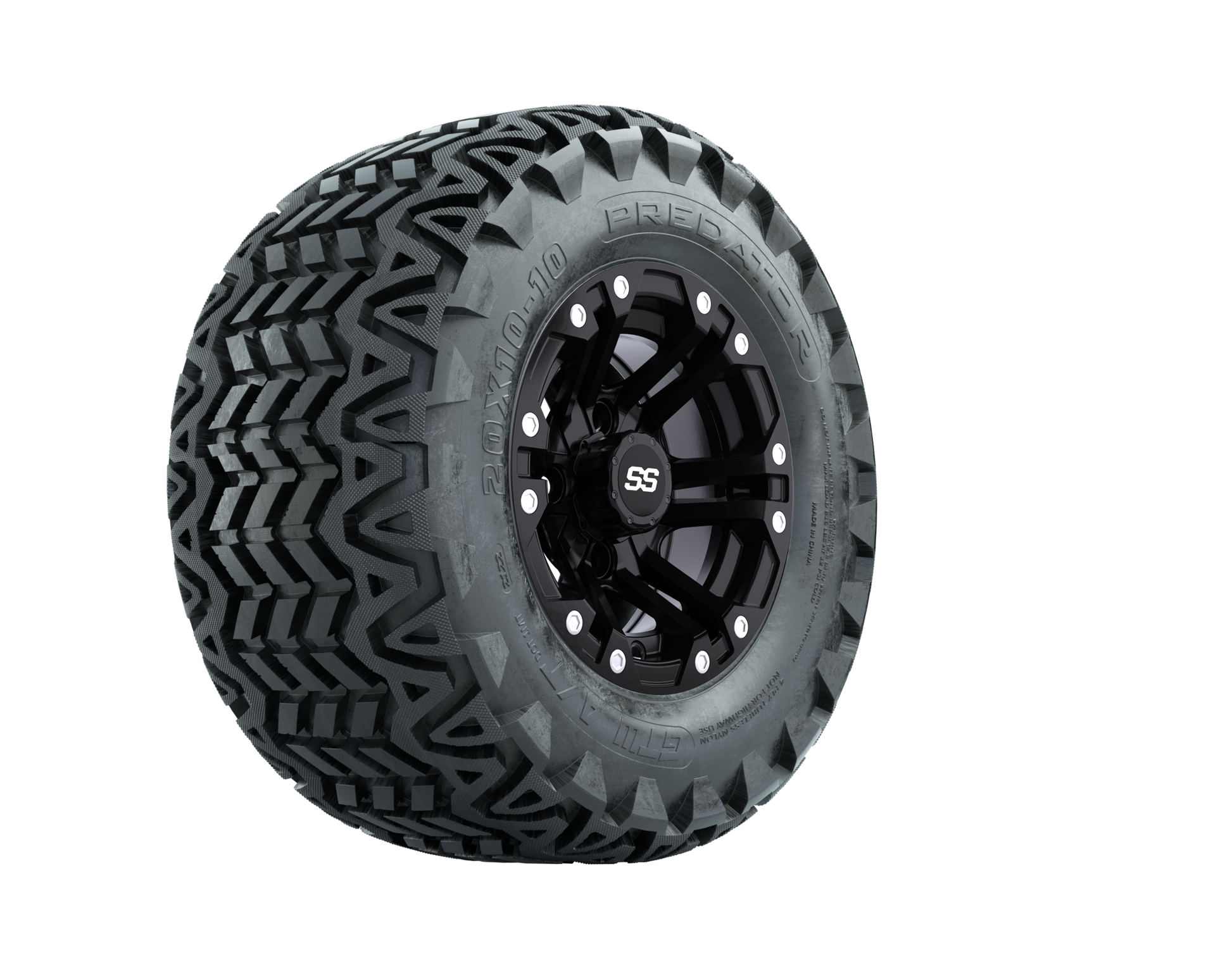 | Product Description: | A set of (4) 10-inch Specter matte black lifted golf cart wheels on 20-inch A/T tires Tread Classification : All-Terrain / Off-Road Full kit includes : (4) 10" Specter Matte Black Wheels / Offset: 3:4 (ET -.25) (4) 20" Predator A/T Tires (4-Ply) (4) center caps Please Note: All Wheels are 4 on 4 Hole / Lug Pattern unless otherwise specified. Tech Tips: This Tire & Wheel Combo Requires a Lift Kit Tire & Wheel Combos are mounted and Inflated Before Shipping, Free of Charge Please Check and Adjust PSI in Tires Before Operation (Recommended Inflation Can Be Found on Sidewall of Tire) All Wheels Have a lug pattern of "4x101.6mm" Lug Nuts Sold Separately: Standard Chrome Lug Nuts #LUG4S Metric Chrome Lug Nuts #LUG4M (Yamaha Models) Club Car Precedent / Onward / Tempo require a low pro lift kit for any 12- or larger TWA combos (#95560 Jake-s Lo Pro Lift) Please Note: Tire and Wheel Ships Fully Mounted, Inflated, and Ready for Installation (*Please check PSI upon installation prior to operating) - Lug Nuts Sold Separately |